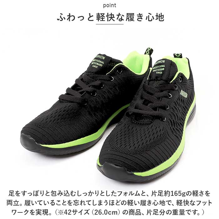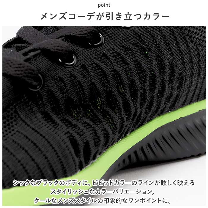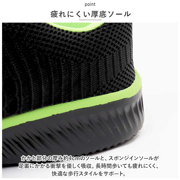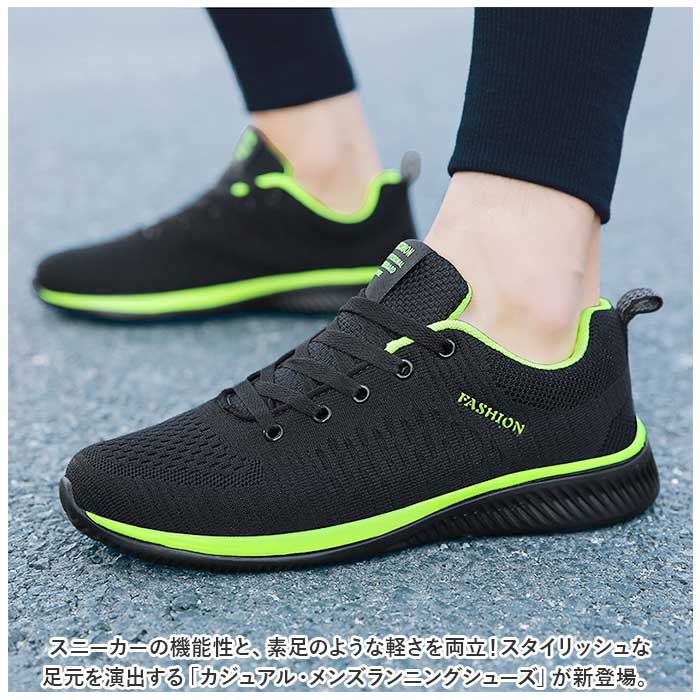 | 商品説明 | スニーカーの機能性と、素足のような軽さを両立!スタイリッシュな足元を演出する「カジュアル・メンズランニングシューズ」が新登場。【通気性抜群のニット素材】アッパー部分の生地は、スリット状の畝を刻んだニット素材と目の細かいメッシュをシームレスに編み上げ、素足のまま履いてもサラッと快適。【疲れにくい厚底ソール】かかと部分の厚み約4cmのソールと、スポンジインソールが足裏にかかる衝撃を優しく吸収。長時間歩いても疲れにくく、快適な歩行スタイルをサポート。【ふわっと軽快な履き心地】足をすっぽりと包み込むしっかりとしたフォルムと、片足約165gの軽さを両立。履いていることを忘れてしまうほどの軽い履き心地で、軽快なフットワークを実現。(※42サイズ(26.0cm)の商品、片足分の重量です。)【柔らかな履き口がフィット】履き口周りも厚みのあるクッション生地で仕上げ、足首やかかとを靴ズレから優しく保護。かかとのプルタブで着脱もスムーズ。【調整自在なシューレーススタイル】足の甲の幅に合わせてサイズ調整が自在にできる、クラシックなシューレーススタイル。【滑りにくいアウトソール】流線形の凹凸を刻んだアウトソールが、雨に濡れた路面やフラットなフロアーもしっかりとグリップ。【いつでも清潔インソール】足裏のカーブにフィットするスポンジインソールは取り外しが可能。こまめにお手入れができて、いつでも清潔さをキープ。【嬉しい脚長効果も♪】ちょっぴり厚底約4cmのソールで脚長効果にも期待♪スポーツやお出掛けの時も、素敵にスタイルUP!【スポーツや普段使いに最適】ジムでのトレーニングや、ランニングなどのフィットネスにはもちろん、ちょっとそこまでのお出掛けやオフィス用のコンフォートシューズにもオススメ。【メンズコーデが引き立つカラー】シックなブラックのボディに、ビビッドカラーのラインが眩しく映えるスタイリッシュなカラーバリエーション。クールなメンズスタイルの印象的なワンポイントに。 |