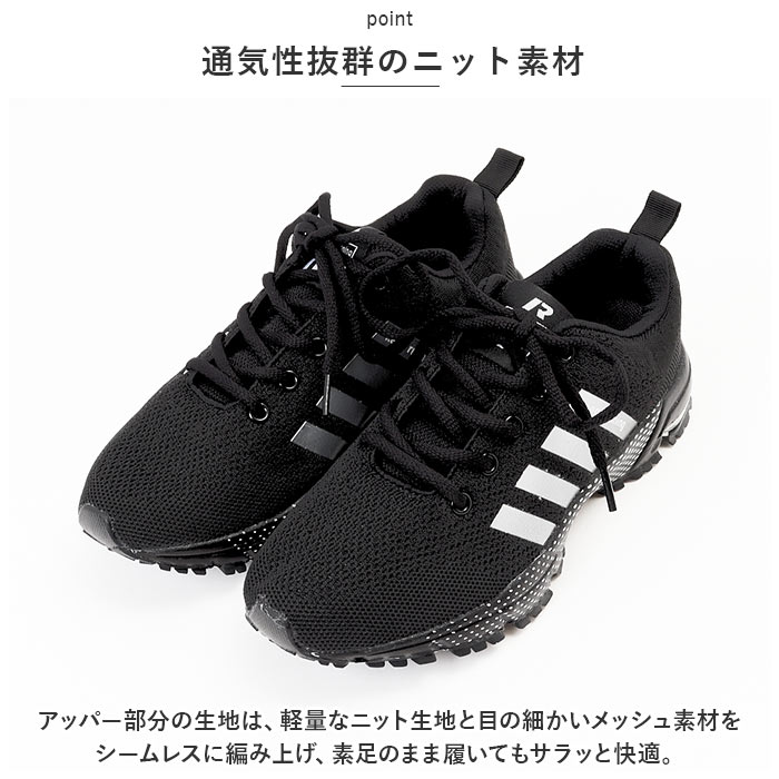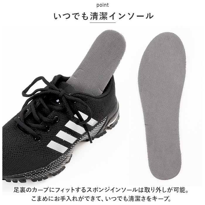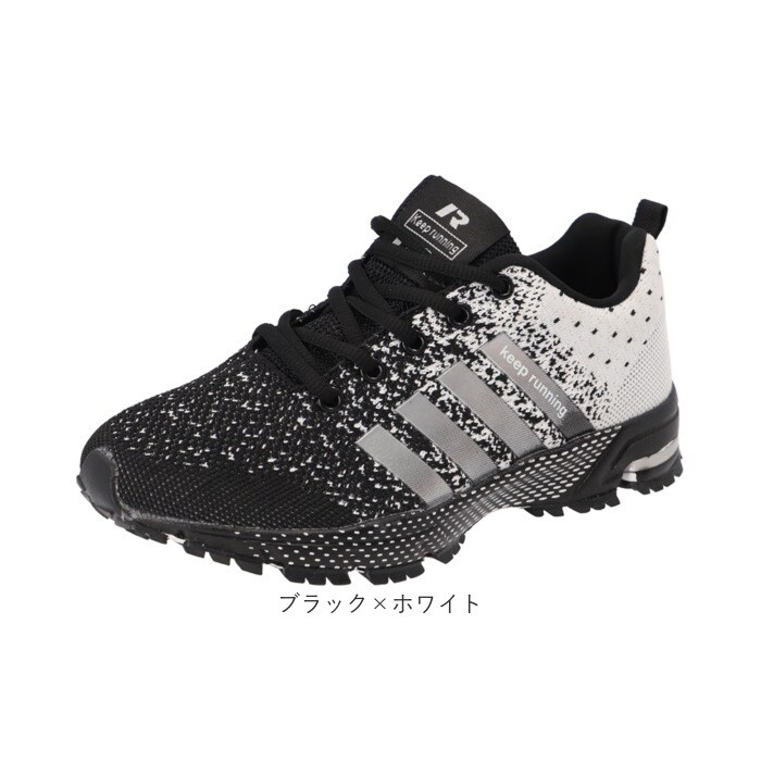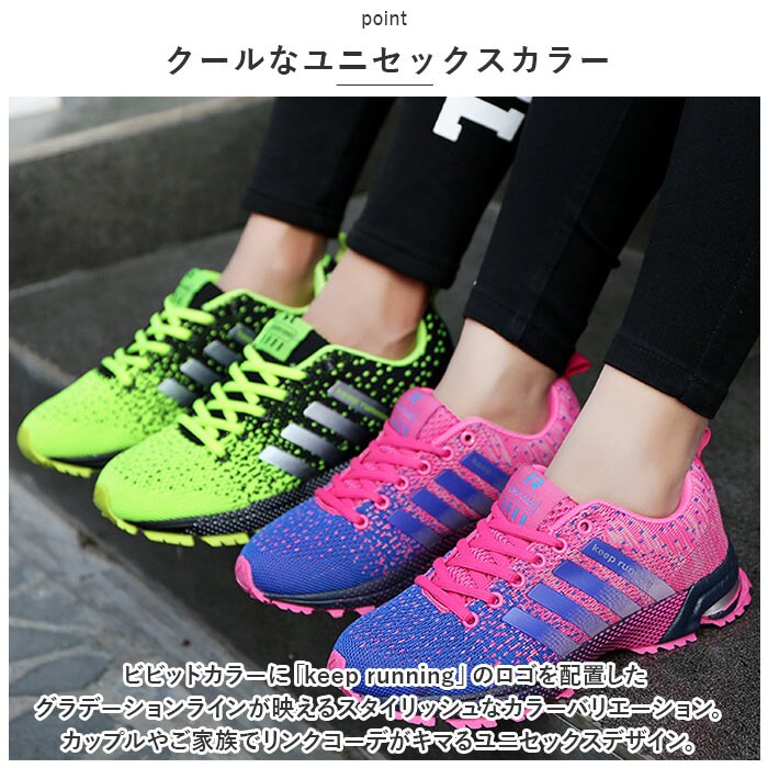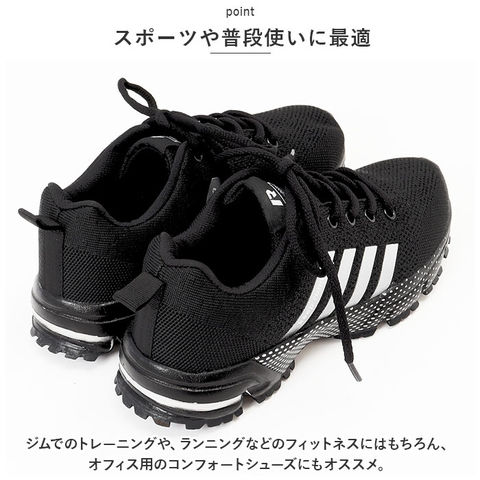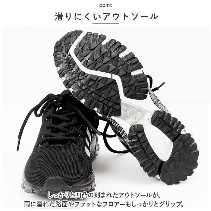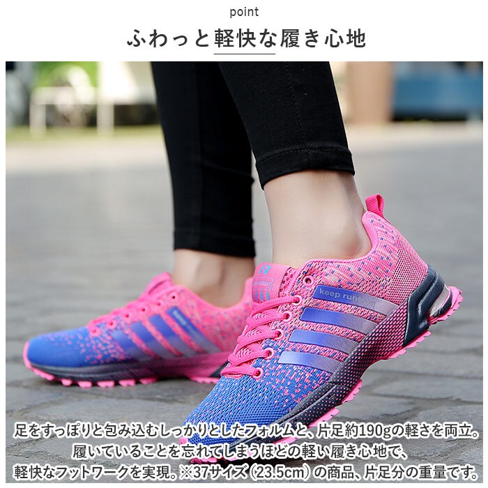 | 商品説明 | スポーツでもタウンユースでも快適なフットワークをサポート!スタイリッシュな足元を演出する「カジュアル・ランニングスニーカー」が新登場。【通気性抜群のニット素材】アッパー部分の生地は、軽量なニット生地と目の細かいメッシュ素材をシームレスに編み上げ、素足のまま履いてもサラッと快適。【疲れにくい厚底ソール】かかと部分の厚み約3.5cmのソールと、スポンジインソールが足裏にかかる衝撃を優しく吸収。長時間歩いても疲れにくく、快適な歩行スタイルをサポート。【ふわっと軽快な履き心地】足をすっぽりと包み込むしっかりとしたフォルムと、片足約190gの軽さを両立。履いていることを忘れてしまうほどの軽い履き心地で、軽快なフットワークを実現。(※37サイズ(23.5cm)の商品、片足分の重量です。)【柔らかな履き口がフィット】履き口周りも厚みのあるクッション生地で仕上げ、足首やかかとを靴ズレから優しく保護。かかとのプルタブで着脱もスムーズ。【調整自在なシューレーススタイル】足の甲の幅に合わせてサイズ調整が自在にできる、クラシックなシューレーススタイル。シュータン部分が柔らかメッシュになっているので、通気性もばっちり。【滑りにくいアウトソール】しっかりと凹凸の刻まれたアウトソールが、雨に濡れた路面やフラットなフロアーもしっかりとグリップ。【いつでも清潔インソール】足裏のカーブにフィットするスポンジインソールは取り外しが可能。こまめにお手入れができて、いつでも清潔さをキープ。【スポーツや普段使いに最適】ジムでのトレーニングや、ランニングなどのフィットネスにはもちろん、ちょっとそこまでのお出掛けやオフィス用のコンフォートシューズにもオススメ。【クールなユニセックスカラー】ビビッドカラーに「keep running」のロゴを配置したグラデーションラインが映えるスタイリッシュなカラーバリエーション。カップルやご家族でリンクコーデがキマるユニセックスデザイン。 |