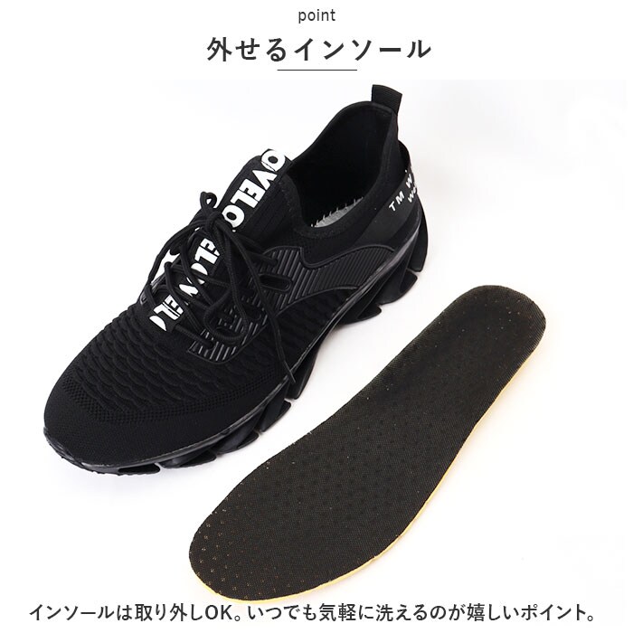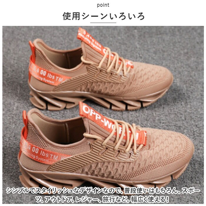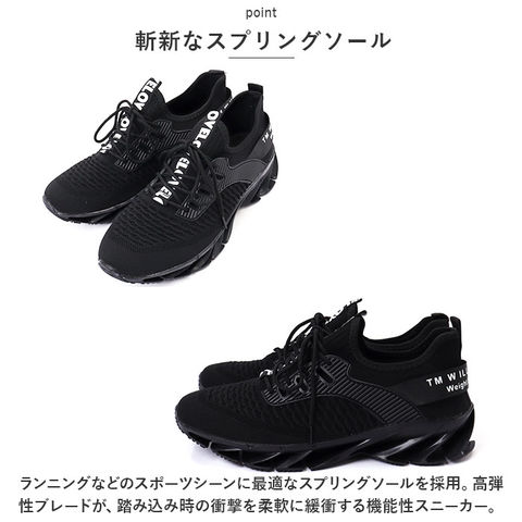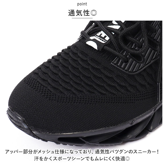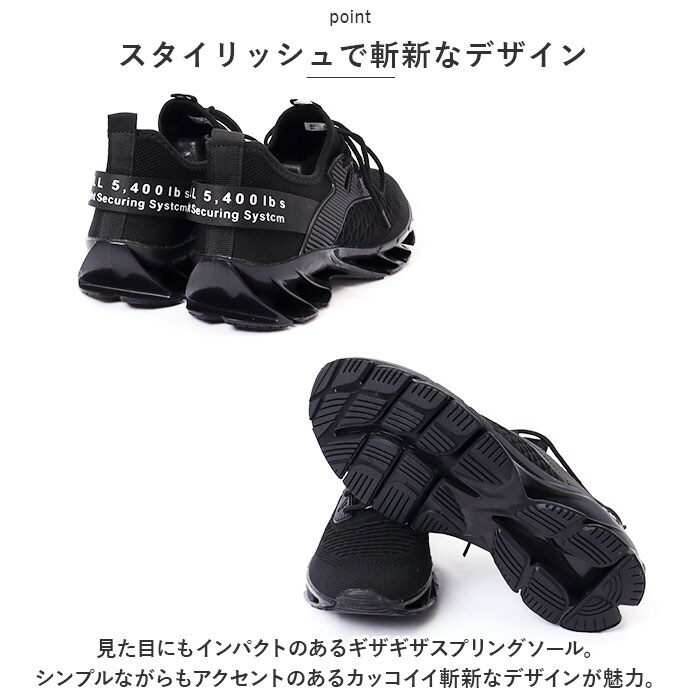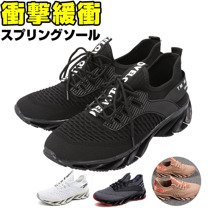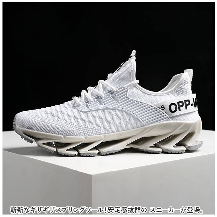 | 商品説明 | 斬新なギザギザスプリングソール!安定感抜群の スニーカーが登場。【斬新なスプリングソール】ランニングなどのスポーツシーンに最適なスプリングソールを採用。高弾性ブレードが、踏み込み時の衝撃を柔軟に緩衝する機能性スニーカー。【スタイリッシュで斬新なデザイン】見た目にもインパクトのあるギザギザスプリングソール。シンプルながらもアクセントのあるカッコイイ斬新なデザインが魅力。【通気性◎】アッパー部分がメッシュ仕様になっており、通気性バツグンのスニーカー!汗をかくスポーツシーンでもムレにくく快適◎【着脱がしやすい】いろんな足にフィットする、柔らかな素材を使用。伸縮性がある履き口で着脱がしやすい。靴紐をキュッと締めればフィット感がアップ!【外せるインソール】インソールは取り外しOK。いつでも気軽に洗えるのが嬉しいポイント。【使用シーンいろいろ】シンプルでスタイリッシュなデザインなので、普段使いはもちろん、スポーツ、アウトドア、レジャー、旅行など。幅広く使える! |