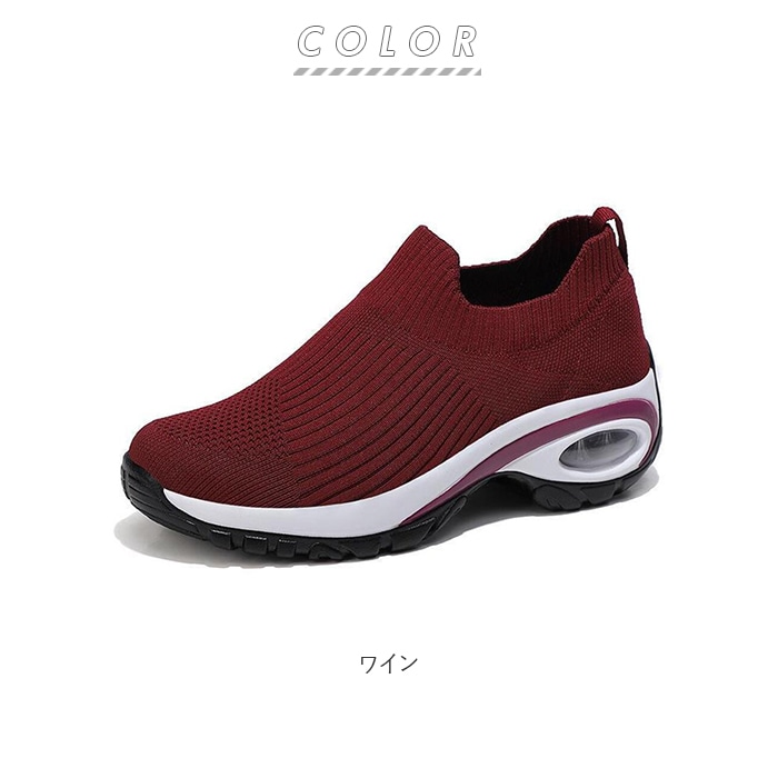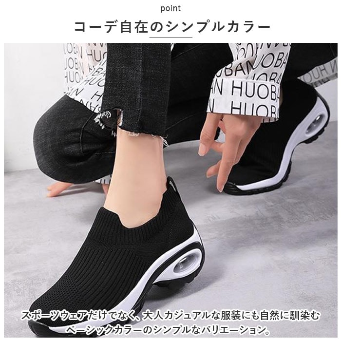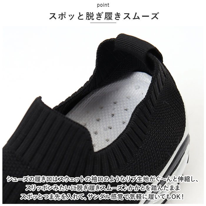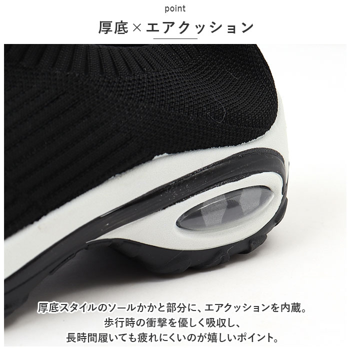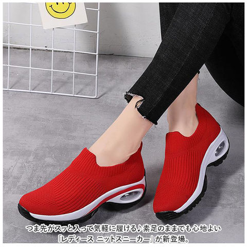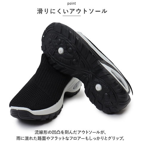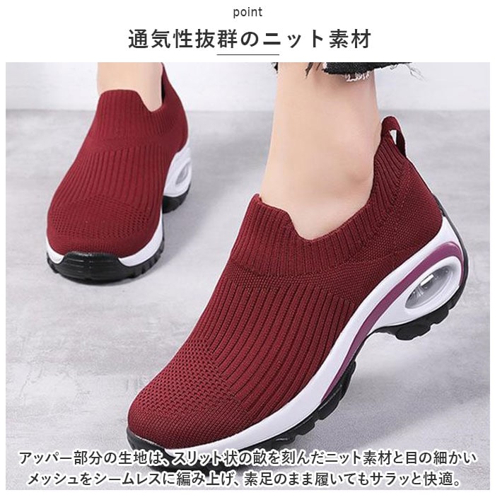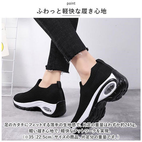 | 商品説明 | つま先がスッと入って気軽に履ける♪素足のままでも心地よい「レディース ニットスニーカー」が新登場。【通気性抜群のニット素材】アッパー部分の生地は、スリット状の畝を刻んだニット素材と目の細かいメッシュをシームレスに編み上げ、素足のまま履いてもサラッと快適。【厚底×エアクッション】厚底スタイルのソールかかと部分に、エアクッションを内蔵。歩行時の衝撃を優しく吸収し、長時間履いても疲れにくいのが嬉しいポイント。【ふわっと軽快な履き心地】足のカタチにフィットする薄手の生地感で、片足の重量はわずか約245g。履いていることを忘れてしまうほどの軽い履き心地で、軽快なフットワークを実現。(※35[22.5cm]サイズの商品、片足分の重量です。)【スポッと脱ぎ履きスムーズ】シューズの履き口はスウェットの袖口のようなリブ生地がぐ~んと伸縮し、スリッポンみたいに脱ぎ履きスムーズ♪かかとを踏んだままスポッとつま先を入れて、サンダル感覚で気軽に履いてもOK!【滑りにくいアウトソール】流線形の凹凸を刻んだアウトソールが、雨に濡れた路面やフラットなフロアーもしっかりとグリップ。【いつでも清潔インソール】足裏のカーブにピタッとフィットするカップインソールは取り外しが可能。こまめにお手入れができて、いつでも清潔さをキープ。【嬉しい脚長効果も♪】ちょっぴり厚底約4cmのソールで脚長効果にも期待♪スポーツやお出掛けの時も、素敵にスタイルUP!【コーデ自在のシンプルカラー】スポーツウェアだけでなく、大人カジュアルな服装にも自然に馴染むベーシックカラーのシンプルなバリエーション。【スポーツや普段使いに最適】ジムでのトレーニングや、ランニングなどのフィットネスにはもちろん、ちょっとそこまでのお出掛けやオフィス用のコンフォートシューズにもオススメ! |