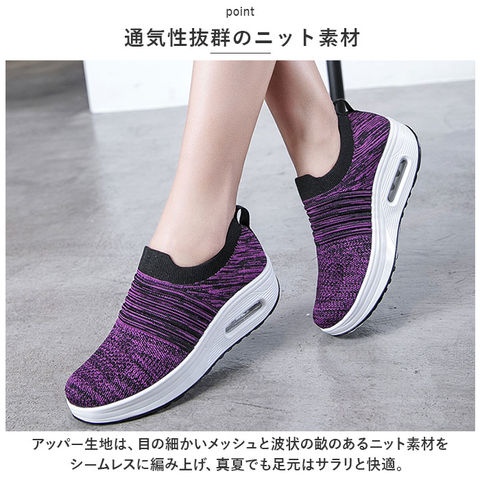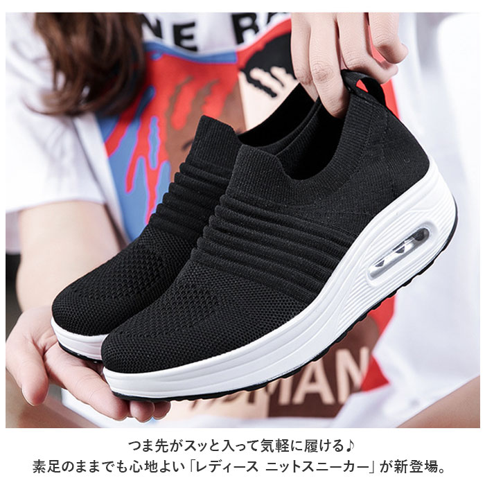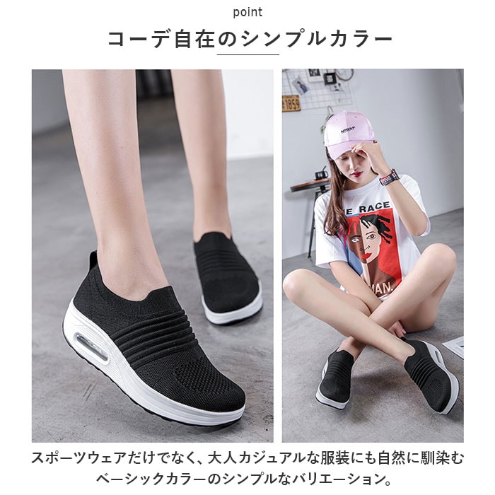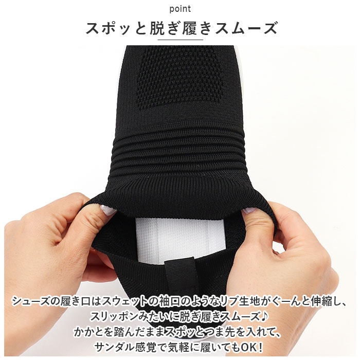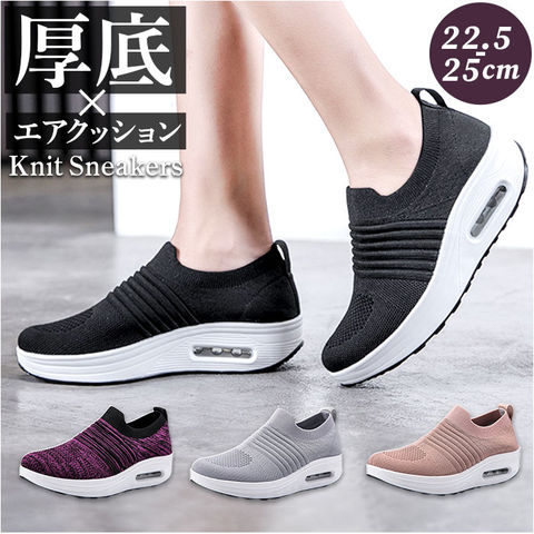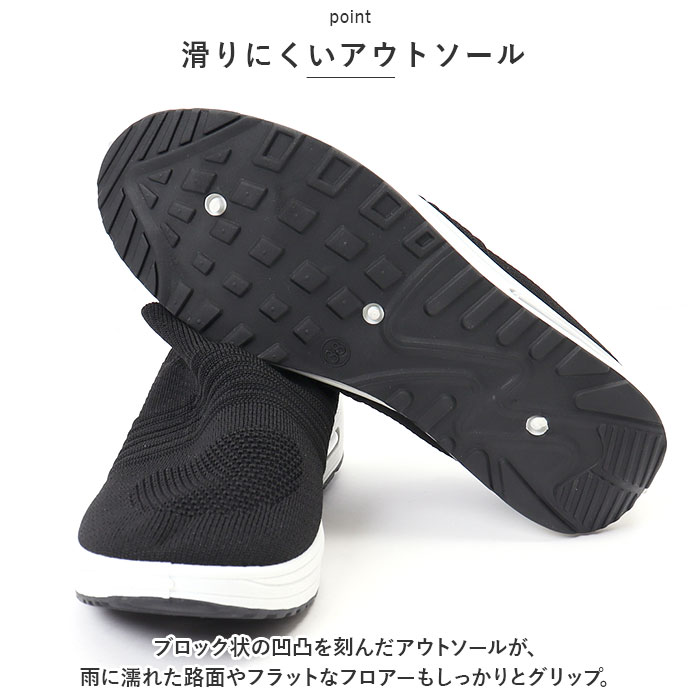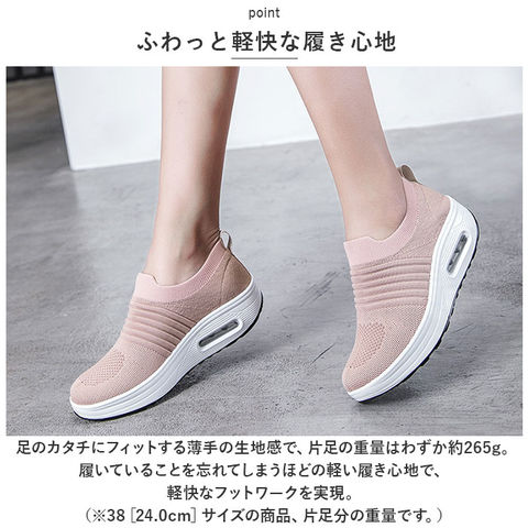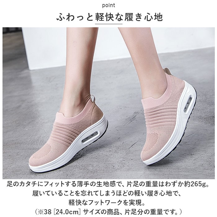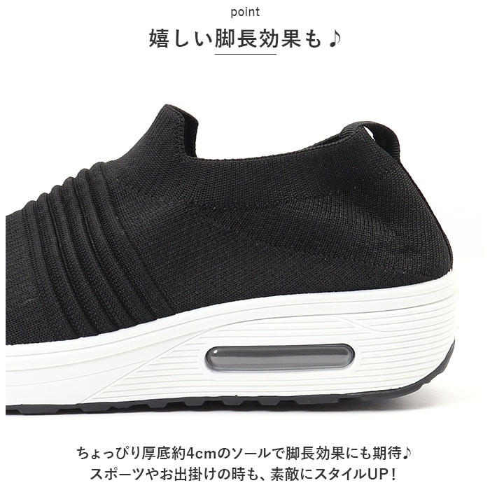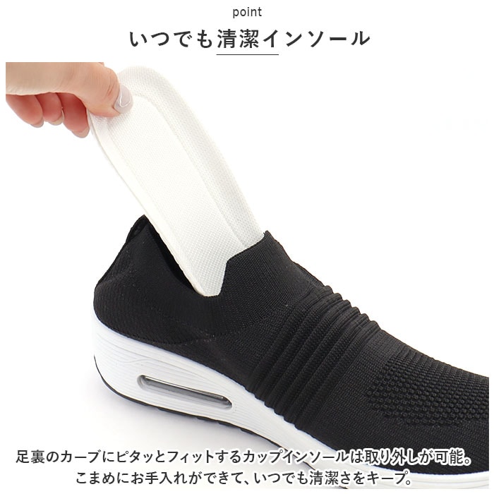 | 商品説明 | つま先がスッと入って気軽に履ける♪素足のままでも心地よい「レディース ニットスニーカー」が新登場。【通気性抜群のニット素材】アッパー生地は、目の細かいメッシュと波状の畝のあるニット素材をシームレスに編み上げ、真夏でも足元はサラリと快適。【厚底×エアクッション】厚底スタイルのソールかかと部分に、エアクッションを内蔵。歩行時の衝撃を優しく吸収し、長時間履いても疲れにくいのが嬉しいポイント。【ふわっと軽快な履き心地】足のカタチにフィットする薄手の生地感で、片足の重量はわずか約265g。履いていることを忘れてしまうほどの軽い履き心地で、軽快なフットワークを実現。(※38[24.0cm]サイズの商品、片足分の重量です。)【スポッと脱ぎ履きスムーズ】シューズの履き口はスウェットの袖口のようなリブ生地がぐーんと伸縮し、スリッポンみたいに脱ぎ履きスムーズ♪かかとを踏んだままスポッとつま先を入れて、サンダル感覚で気軽に履いてもOK!【滑りにくいアウトソール】ブロック状の凹凸を刻んだアウトソールが、雨に濡れた路面やフラットなフロアーもしっかりとグリップ。【いつでも清潔インソール】足裏のカーブにピタッとフィットするカップインソールは取り外しが可能。こまめにお手入れができて、いつでも清潔さをキープ。【嬉しい脚長効果も♪】ちょっぴり厚底約4cmのソールで脚長効果にも期待♪スポーツやお出掛けの時も、素敵にスタイルUP!【コーデ自在のシンプルカラー】スポーツウェアだけでなく、大人カジュアルな服装にも自然に馴染むベーシックカラーのシンプルなバリエーション。【スポーツや普段使いに最適】ジムでのトレーニングや、ランニングなどのフィットネスにはもちろん、ちょっとそこまでのお出掛けやオフィス用のコンフォートシューズにもオススメ! |