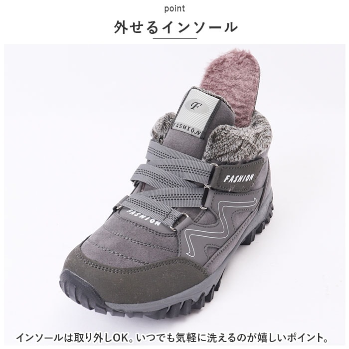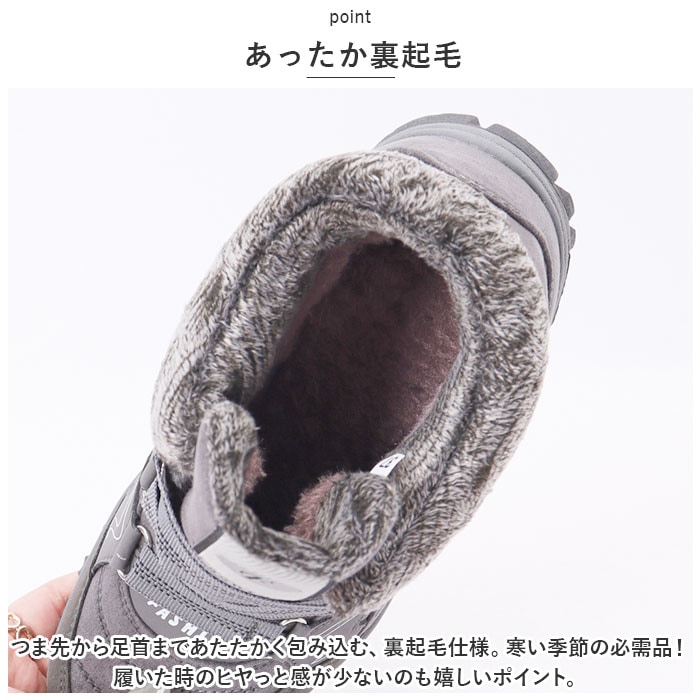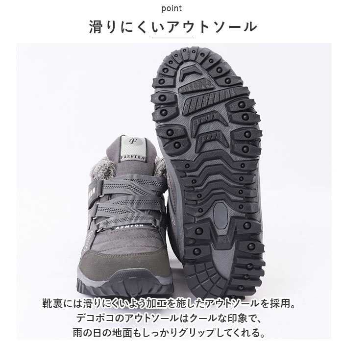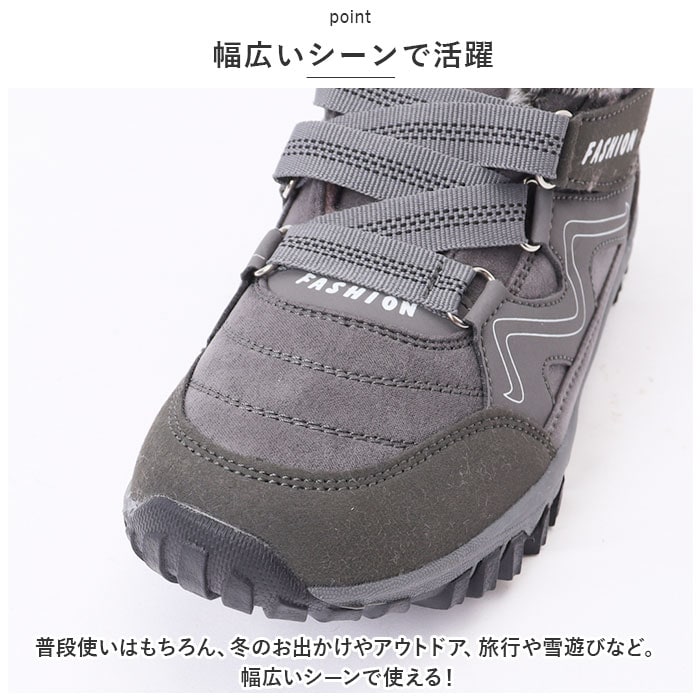 | 商品説明 | 裏起毛で足首まであたたかい♪普段使いからアウトドアまでOK。 スノーブーツ が登場。【あったか裏起毛】つま先から足首まであたたかく包み込む、裏起毛仕様。寒い季節の必需品!履いた時のヒヤっと感が少ないのも嬉しいポイント。【靴紐レス】靴紐の結び直しの手間がかからない、靴紐レス仕様。面ファスナーでペリっと留めるだけでOK、簡単に調節でき、しっかり足にフィット!【滑りにくいアウトソール】靴裏には滑りにくいよう加工を施したアウトソールを採用。デコボコのアウトソールはクールな印象で、雨の日の地面もしっかりグリップしてくれる。【シンプルデザイン】定番のシンプルスニーカーに、裏起毛をプラスした、ユニセックスで使えるデザイン。サイズ展開もあるので、カップルや家族でお揃いにできる☆【幅広いシーンで活躍】普段使いはもちろん、冬のお出かけやアウトドア、旅行や雪遊びなど。幅広いシーンで使える!【外せるインソール】インソールは取り外しOK。いつでも気軽に洗えるのが嬉しいポイント。 |
