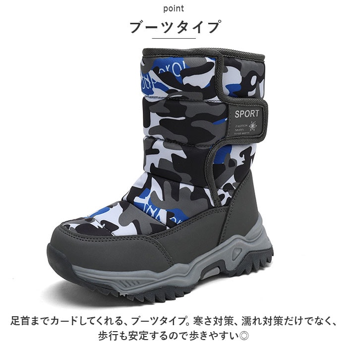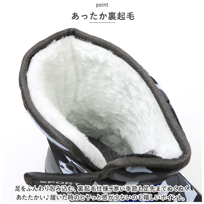 | 商品説明 | 裏起毛で足先まであったかい♪撥水タイプで雨や雪でも安心!キッズ スノーブーツが登場。【あったか裏起毛】足をふんわり包み込む、裏起毛仕様。寒い季節も足先までぬくぬくあたたかい♪履いた時のヒヤっと感が少ないのも嬉しいポイント。【ブーツタイプ】足首までカードしてくれる、ブーツタイプ。寒さ対策、濡れ対策だけでなく、歩行も安定するので歩きやすい◎【撥水機能】水滴を弾く撥水機能アリ!雪の日や濡れた地面を歩いても、水が染み込みにくい。雪遊びなど冬のレジャーにぴったり。※完全防水ではありません。【しっかりソール】靴裏には滑りにくいよう加工を施し、歩きやすさに配慮。しっかりしたアウトソールで、雨の日などの濡れた地面もグリップする安心の仕様。【履きやすい】ガバっと開く履き口には、面ファスナーを搭載。自分でカンタンに着脱できるので、お出かけもスムーズ。【カモフラデザイン】元気なお子様にぴったりなカモフラデザイン。男の子も女の子も似合うカラーバリエーションなので、兄弟姉妹やお友達とお揃いにするのもGOOD♪ |