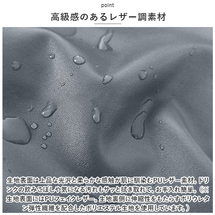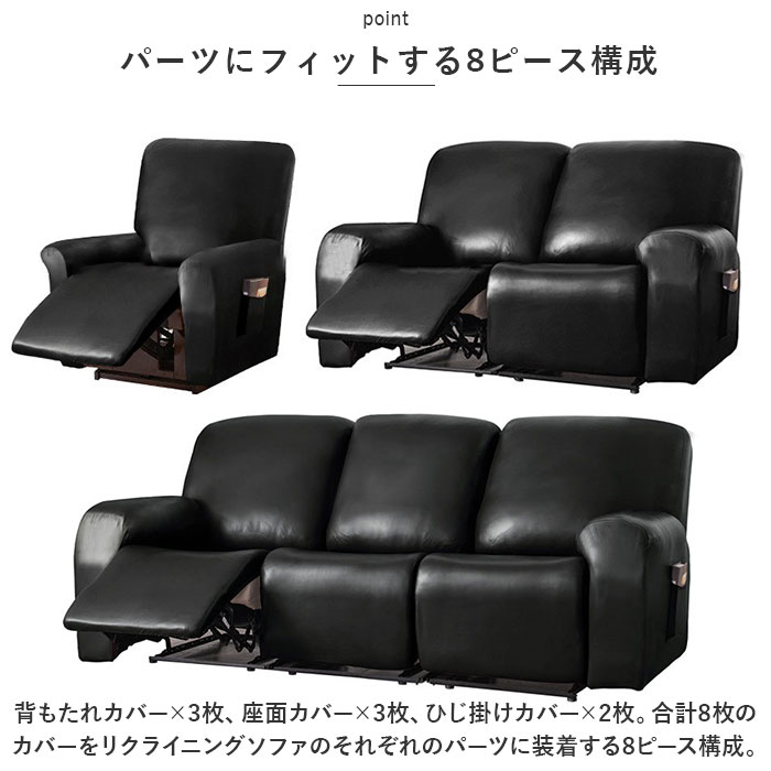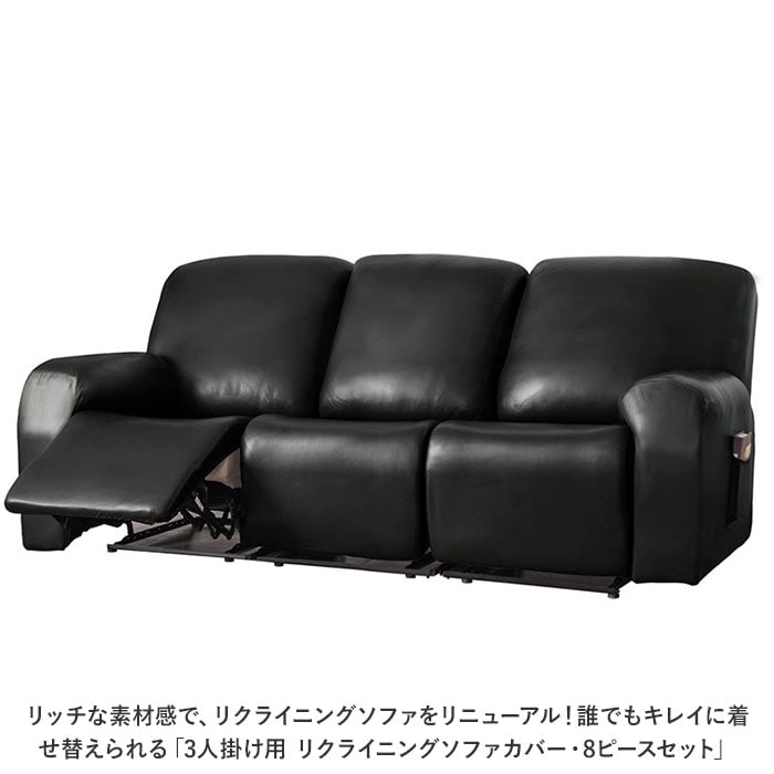 | 商品説明 | リッチな素材感で、リクライニングソファをリニューアル!誰でもキレイに着せ替えられる「3人掛け用 リクライニングソファカバー・8ピースセット」【ぐーんと伸びるストレッチ素材】タテ・ヨコに程よく伸縮するストレッチ素材が、リクライニングソファの8つのパーツにぴったりフィットして、まるごとフルカバー。【パーツにフィットする8ピース構成】背もたれカバー×3枚、座面カバー×3枚、ひじ掛けカバー×2枚。合計8枚のカバーをリクライニングソファのそれぞれのパーツに装着する8ピース構成。【便利なミニポケット付き】両サイドの「ひじ掛けカバー」には、スマホやテレビのリモコンをちょい置きするのにちょうどいいミニポケット付き。【高級感のあるレザー調素材】生地表面は上品な光沢と柔らかな感触が肌に馴染むPUレザー素材。ドリンクの飲みこぼしや気になる汚れもサッと拭き取れて、お手入れ簡単。(※生地表面にはPUフェイクレザー。生地裏側に伸縮性をもたらすポリウレタン弾性繊維を配合したポリエステル生地を使用しています。)【選べるカラーで、気持ち華やぐ】いつものお部屋をちょっぴり贅沢に彩る、上品で深みのあるカラーバリエーション。家庭用のリクライニングソファだけでなく、オフィスやショップなど来客用ソファのリニューアルにもオススメ。【セット内容】・背もたれカバー×3枚、座面カバー×3枚、ひじ掛けカバー×2枚・フック付きゴムストラップ×9本 |