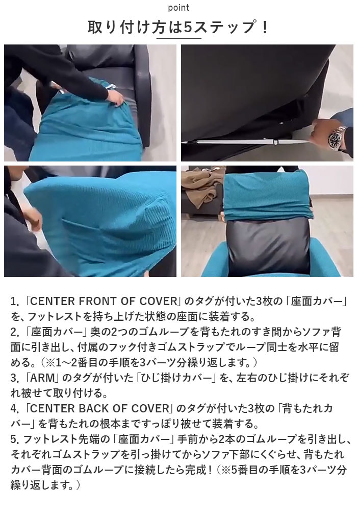 | 注意点 | 【取り付け方は5ステップ!】1.「CENTER FRONT OF COVER」のタグが付いた3枚の「座面カバー」を、フットレストを持ち上げた状態の座面に装着する。2.「座面カバー」奥の2つのゴムループを背もたれのすき間からソファ背面に引き出し、付属のフック付きゴムストラップでループ同士を水平に留める。(※1~2番目の手順を3パーツ分繰り返します。)3.「ARM」のタグが付いた「ひじ掛けカバー」を、左右のひじ掛けにそれぞれ被せて取り付ける。4.「CENTER BACK OF COVER」のタグが付いた3枚の「背もたれカバー」を背もたれの根本まですっぽり被せて装着する。5.フットレスト先端の「座面カバー」手前から2本のゴムループを引き出し、それぞれゴムストラップを引っ掛けてからソファ下部にくぐらせ、背もたれカバー背面のゴムループに接続したら完成!(※5番目の手順を3パーツ分繰り返します。)海外輸入品のため、商品によってはパッケージや説明書が、英語や中国語表記となっている場合があります。商品を安価でご提供させていただくため、輸入時のパッケージのままでのお届けとなります。予めご了承くださいませ。商品の写真はできる限り実物のお色に近づけるように加工しておりますが、お使いのモニター設定、お部屋の照明などにより、実際の商品と異なる場合がございます。商品の生産時期などにより、付属品(ボタン、ファスナー、タグ、パッケージなど)のデザインや仕様の一部が変更になる場合がございますが、予めご了承くださいませ。商品や個体差などにより、表記と若干異なる場合がございますが、予めご了承くださいませ。輸入品のため、糸の継ぎ目や縫製等が甘い部分、糊跡等が生じる場合がございますが、予めご了承くださいませ。生地の特性上、やや匂いが強く感じられるものもございます。数日のご使用や陰干しなどで気になる匂いはほとんど感じられなくなります。お手入れなどはタグなどの表記をご確認ください。配送の方法によっては、商品に多少のシワ等ができる場合がございますが、出来る限りお客様にリーズナブルな価格帯でご提供するためです。ご了承くださいませ。採寸方法の違いにより、多少の誤差がある場合がございます。 |