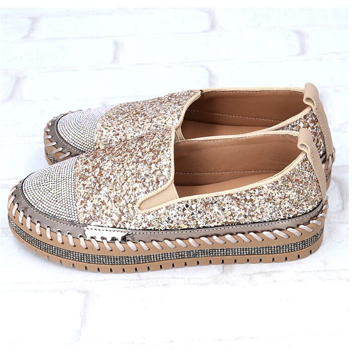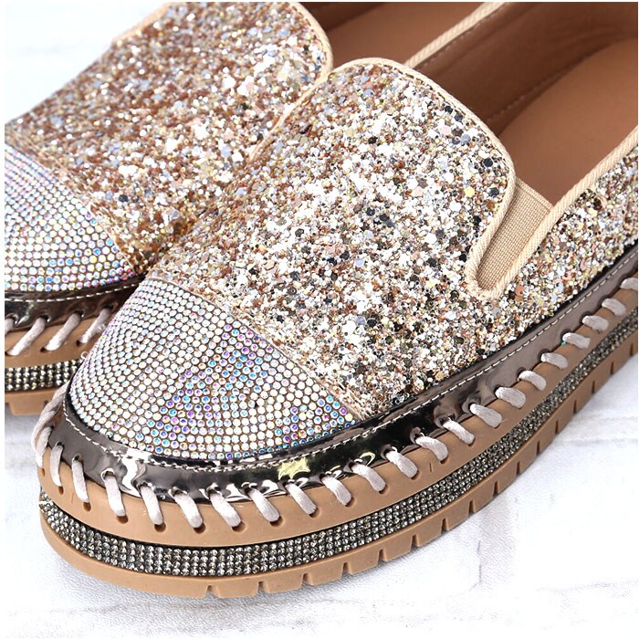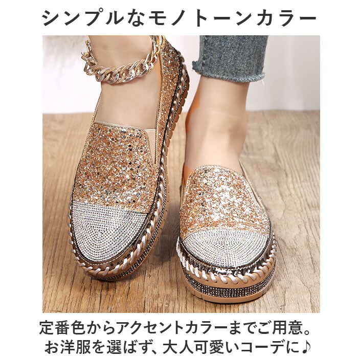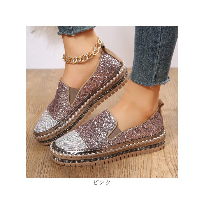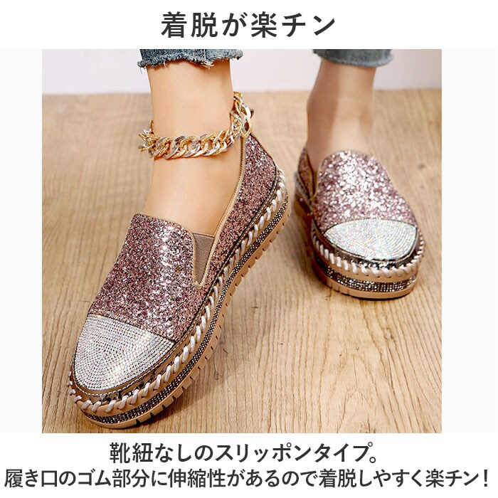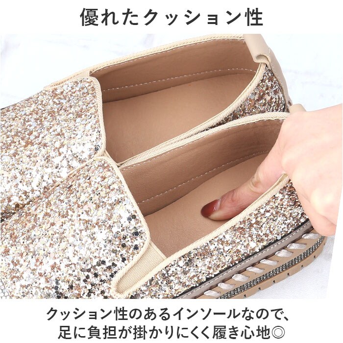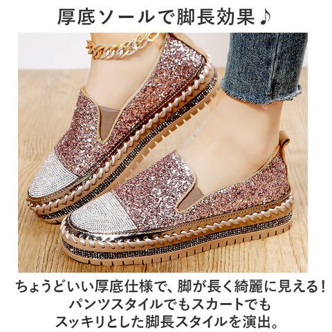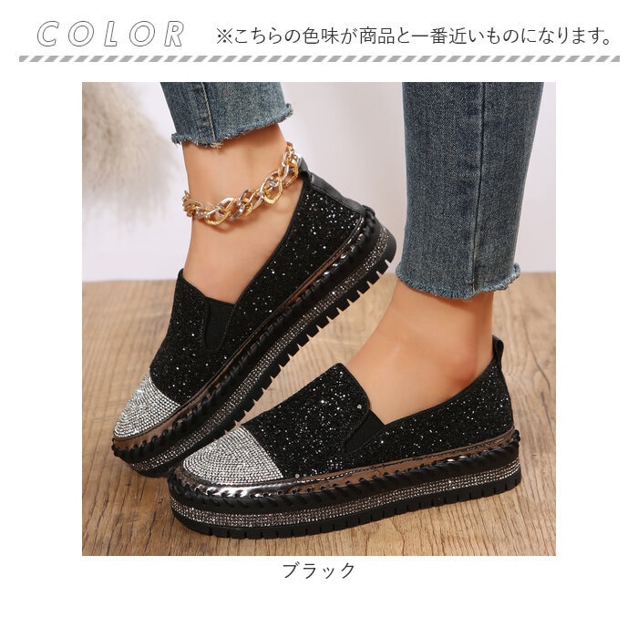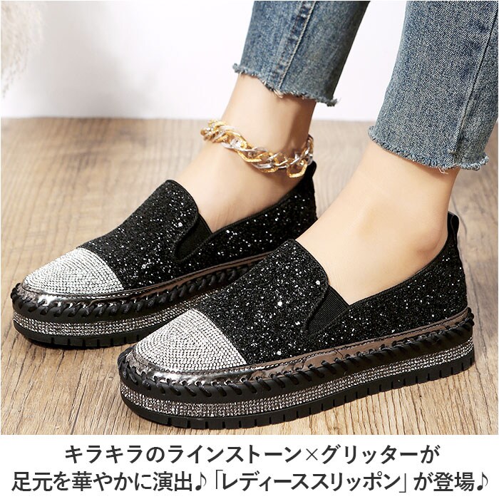 | 商品説明 | キラキラのラインストーン×グリッターが足元を華やかに演出♪「レディーススリッポン」が登場♪【豪華なラインストーンをつま先に】トゥとアウトソール部分には贅沢にラインストーンを使用!いつものコーデに合わせるだけでグッとおしゃれに♪【厚底ソールで脚長効果♪】ちょうどいい厚底仕様で、脚が長く綺麗に見える!パンツスタイルでもスカートでもスッキリとした脚長スタイルを演出。【着脱が楽チン】靴紐なしのスリッポンタイプ。履き口のゴム部分に伸縮性があるので着脱しやすく楽チン!【優れたクッション性】クッション性のあるインソールなので、足に負担が掛かりにくく履き心地◎【シンプルなモノトーンカラー】定番色からアクセントカラーまでご用意。お洋服を選ばず、大人可愛いコーデに♪ |