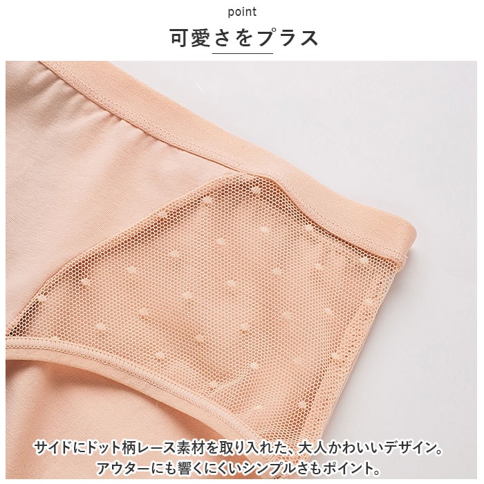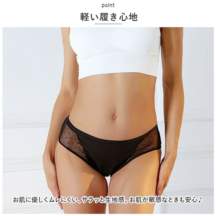 | 商品説明 | ブルーな日を快適に♪急な生理にも対応できる、吸水サニタリーショーツ3枚セットが新登場。【可愛さをプラス】サイドにドット柄レース素材を取り入れた、大人かわいいデザイン。アウターにも響くにくいシンプルさもポイント。【漏れをガード】クロッチ部分~前後にかけて吸水素材を使用しているから、多い日のお出かけや就寝時も安心◎軽い日はナプキンなしでもOK。(※吸水力には限界があるため、経血量に応じてナプキンやタンポンを併用してください。)【軽い履き心地】お肌に優しくムレにくい、サラッと生地感。お肌が敏感なときも安心♪【締めつけ感がなくストレスフリー】程よく伸縮性もあり、お尻まわりを優しく包み込んで心地よくフィット。【洗濯の心配不要】洗い替えに便利な3枚セット。 |