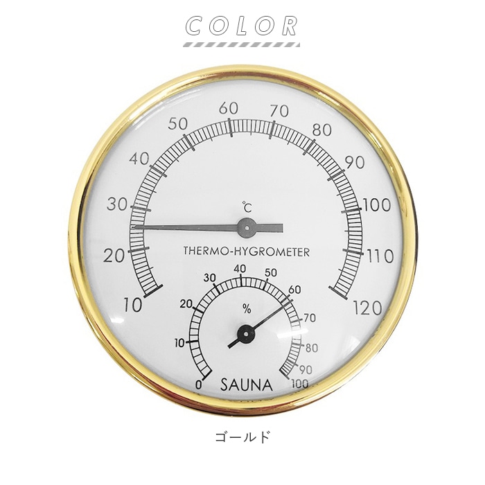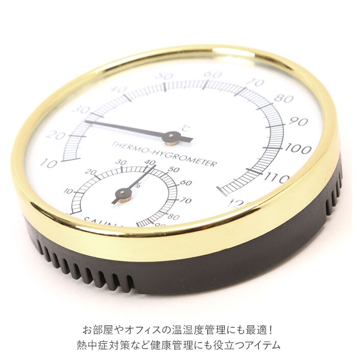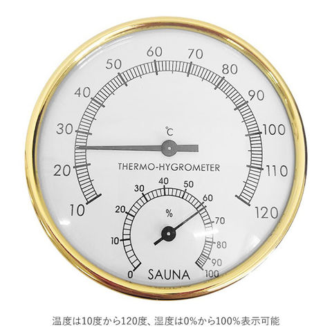 商品説明サウナや浴室でも使用できる、温湿度計。温度と湿度がひと目でわかる、読みやすい文字盤デザイン。温度は10度から120度、温度は0%から100%表示可能。場所をとらないコンパクトサイズ◎背面には、壁掛けできるフック穴付き。お部屋やオフィスの温湿度管理にも最適!熱中症対策など健康管理にも役立つアイテム。