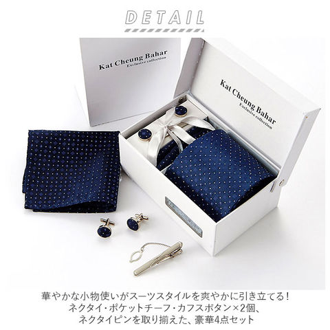 | 商品説明 | 華やかな小物使いがスーツスタイルを爽やかに引き立てる!スタイリッシュなネクタイ4点セット。ネクタイ・ポケットチーフ・カフスボタン×2個、ネクタイピンを取り揃えた、豪華4点セット。ネクタイはレジメンタルストライプやドット柄、メアンドロス紋様など、シーンに合わせて使い分けのできる豊富なカラーバリエーション。お揃いの柄のポケットチーフを胸ポケットから覗かせることで、スーツの胸元をより華やかで洗練された雰囲気に演出。ネクタイもポケットチーフも、かすかな光沢がエレガントに艶めく、シワになりにくいポリエステルファブリックを使用。ネクタイピンは、煌めくビジューを小さく埋め込んだシンプルなシルバーカラー。ジャケットを羽織っていない時でも、スタイルに落ち着きと清潔感をプラス!ネクタイと同じファブリックで仕上げたカフスボタンでトータルコーディネートが完成。スウィヴル式で簡単に取り付けることができ、袖口でキラリと光るさりげないアクセントに。白地に英字のロゴプリントの入った化粧箱に、手提げ袋が付属。入社祝いや学生さんの入学祝いのギフトにも最適。 |