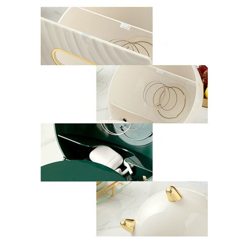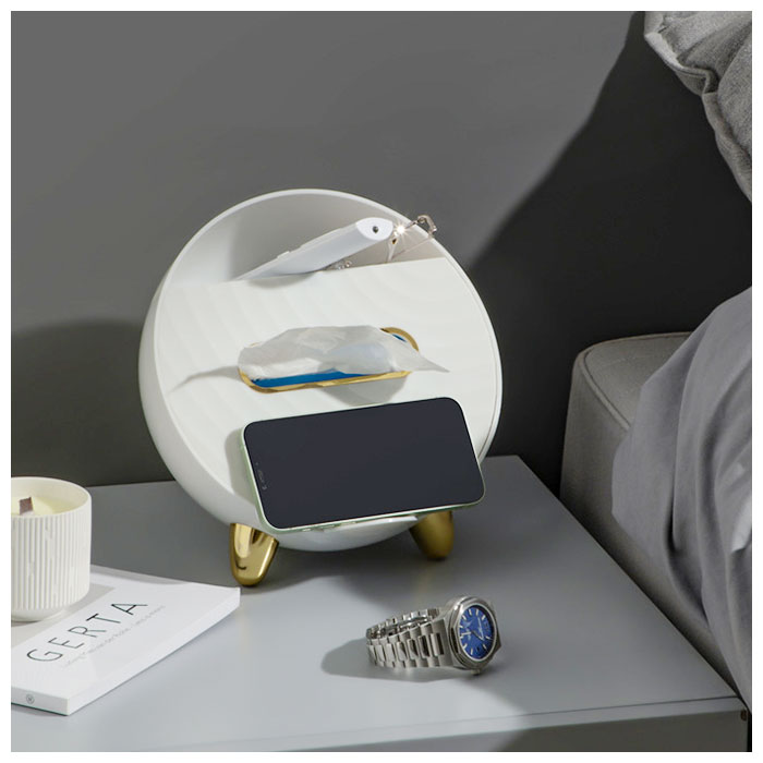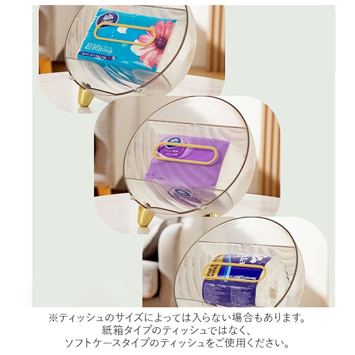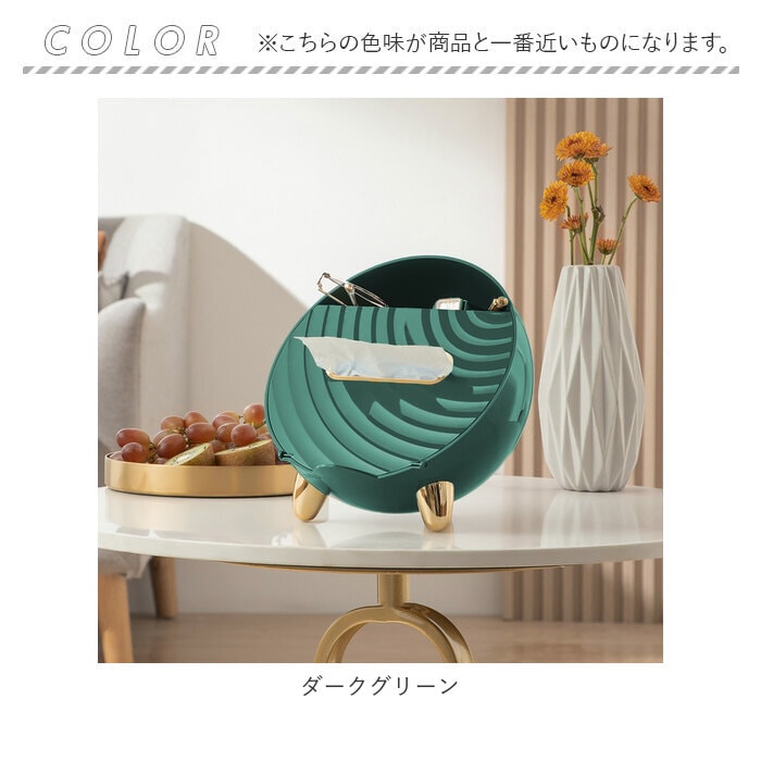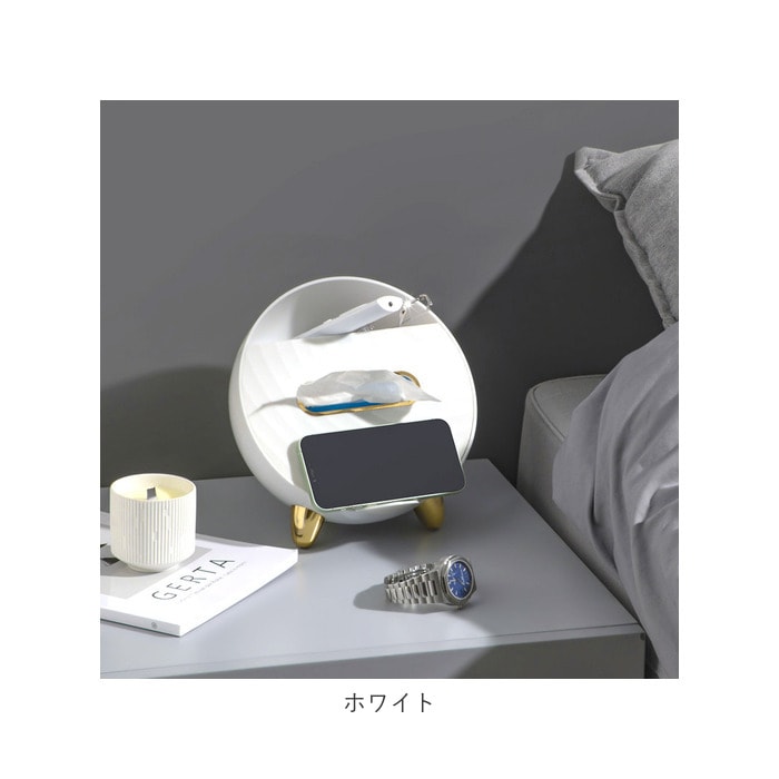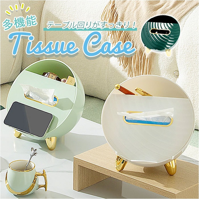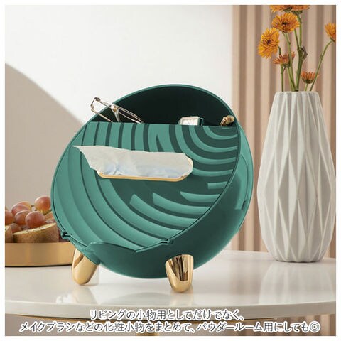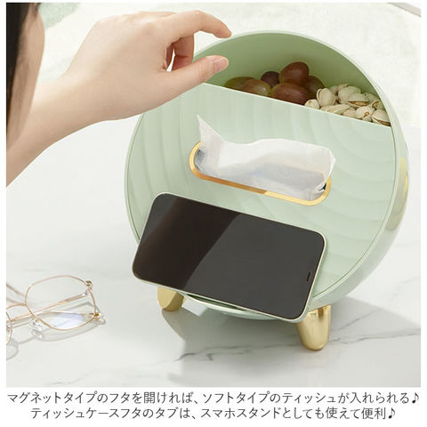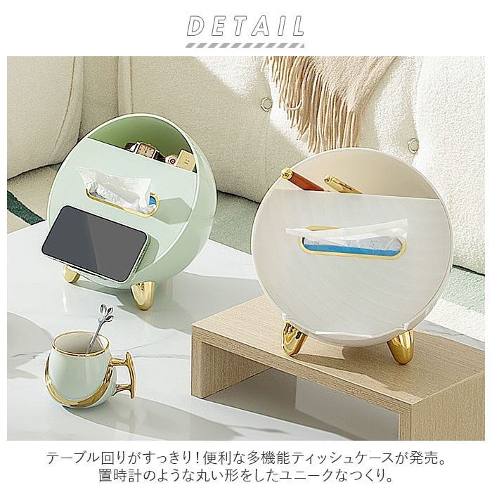 | 商品説明 | テーブル回りがすっきり!便利な多機能ティッシュケースが発売。置時計のような丸い形をしたユニークなつくり。マグネットタイプのフタを開ければ、ソフトタイプのティッシュが入れられる♪(※ティッシュのサイズによっては入らない場合もあります。紙箱タイプのティッシュではなく、ソフトケースタイプのティッシュをご使用ください。)中にはバネが内蔵されていて、枚数が少なくなっても取り出しやすい。ティッシュケースフタのタブは、スマホスタンドとしても使えて便利♪またティッシュ収納部下にイヤホン等、紛失しやすい小物を収納できるスペース付き。ケース上部のラック部分は、テレビやエアコンのリモコン、文房具等を収納可能。リビングの小物用としてだけでなく、メイクブラシなどの化粧小物をまとめて、パウダールーム用にしても◎ゴールドの色遣いが華やかな雰囲気に。 |