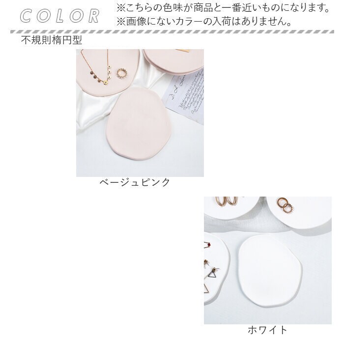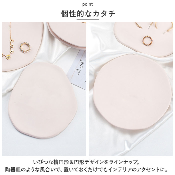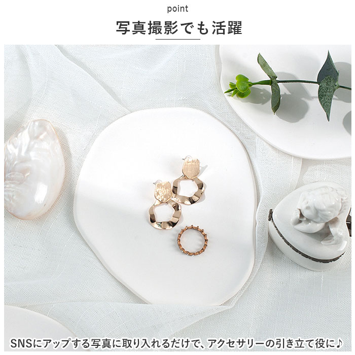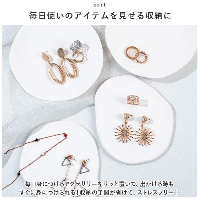 | 商品説明 | 指輪やピアスをおしゃれにディスプレイできる、アクセサリートレーが新登場。【個性的なカタチ】いびつな楕円形&円形デザインをラインナップ。陶器皿のような風合いで、置いておくだけでもインテリアのアクセントに。【毎日使いのアイテムを見せる収納に】毎日身につけるアクセサリーをサッと置いて、出かける時もすぐに身につけられる!収納の手間が省けて、ストレスフリー◎【写真撮影でも活躍】SNSにアップする写真に取り入れるだけで、アクセサリーの引き立て役に♪【使い方いろいろ】アクセサリーだけでなく、鍵や腕時計、ちょっとした小物置きとしても使用OK! |