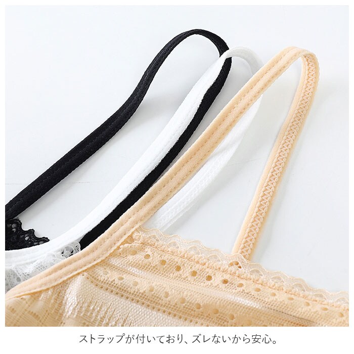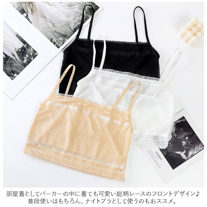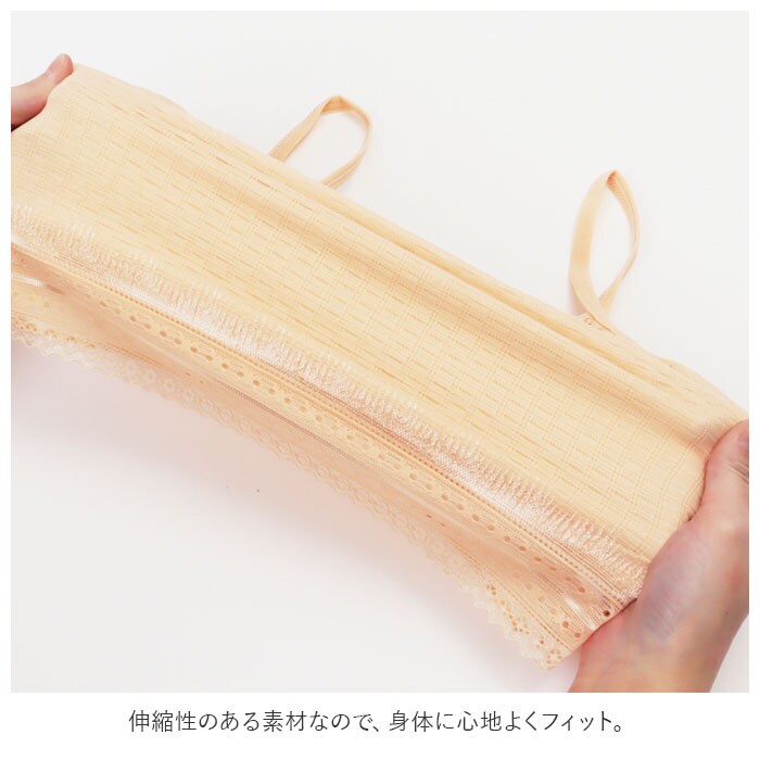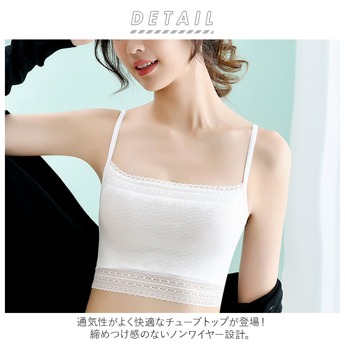 | 商品説明 | 通気性がよく快適なチューブトップが登場!締めつけ感のないノンワイヤー設計。伸縮性のある素材なので、身体に心地よくフィット。ホックなどがなく、頭からすっぽり被るだけで着脱ラクチン◎ストラップが付いており、ズレないから安心。部屋着としてパーカーの中に着ても可愛い総柄レースのフロントデザイン♪普段使いはもちろん、ナイトブラとして使うのもおススメ。 |