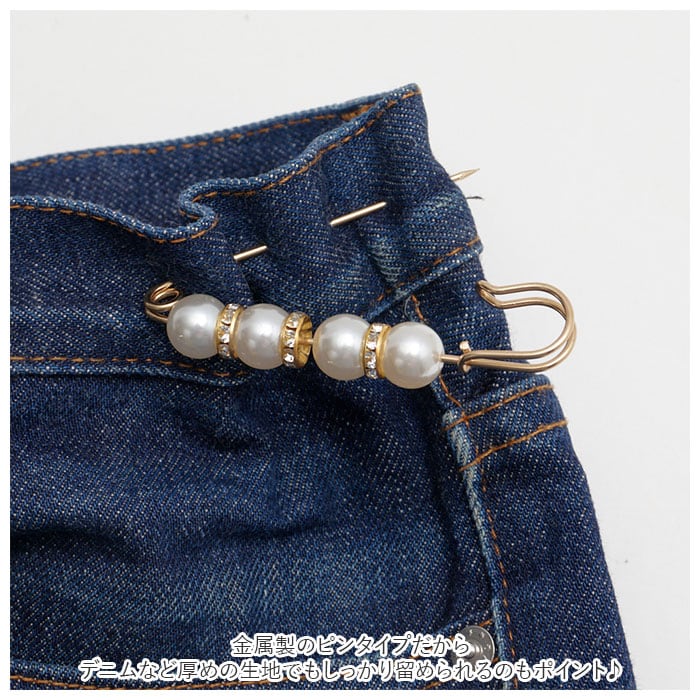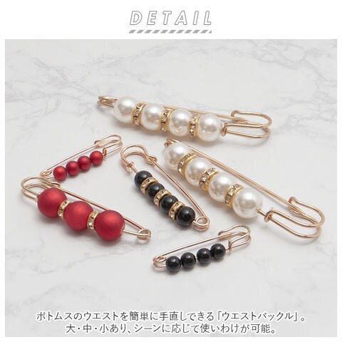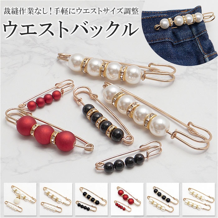 | 商品説明 | ボトムスのウエストを簡単に手直しできる「ウエストバックル」。ピンに余ったウエスト生地に刺し通すだけ♪裁縫作業もなく手軽にウエストサイズを調整できるアイテム。金属製のピンタイプだからデニムなど厚めの生地でもしっかり留められるのもポイント♪ビーズ装飾が付いておりさりげないおしゃれなデザイン。スーツジャケットの胸元やストールに付ければブローチピンとしても使える。大・中・小あり、シーンに応じて使いわけが可能。 |