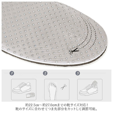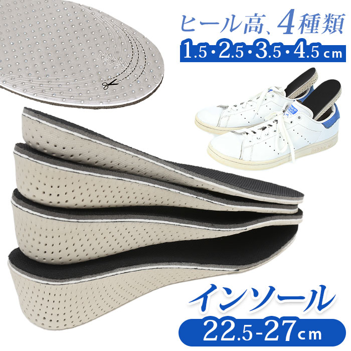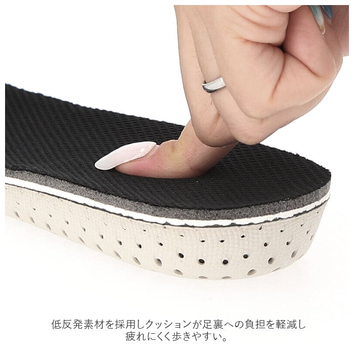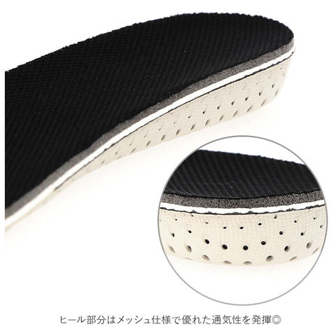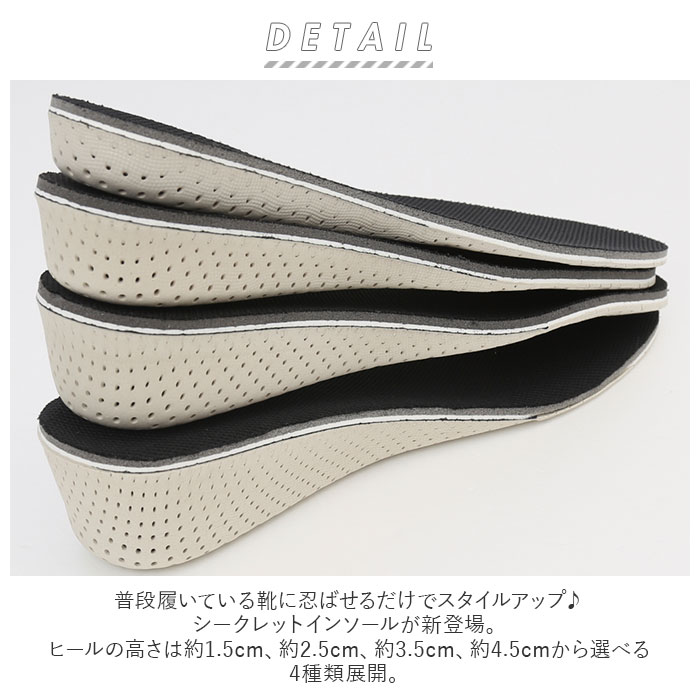 | 商品説明 | 普段履いている靴に忍ばせるだけでスタイルアップ♪シークレットインソールが新登場。ヒールの高さは約1.5cm、約2.5cm、約3.5cm、約4.5cmから選べる4種類展開。低反発素材を採用しクッションが足裏への負担を軽減し疲れにくく歩きやすい。ヒール部分はメッシュ仕様で優れた通気性を発揮◎約22.5cm~約27.0cmまでの靴サイズ対応!靴のサイズに合わせてつま先部分をカットして調節可能。 |