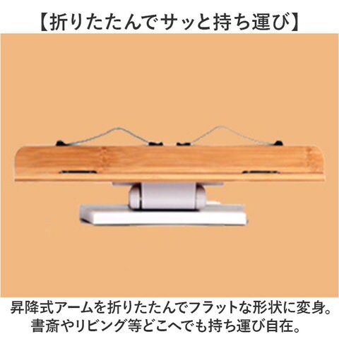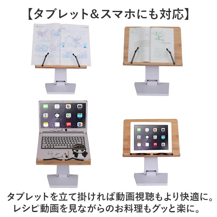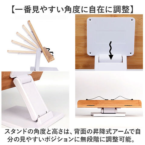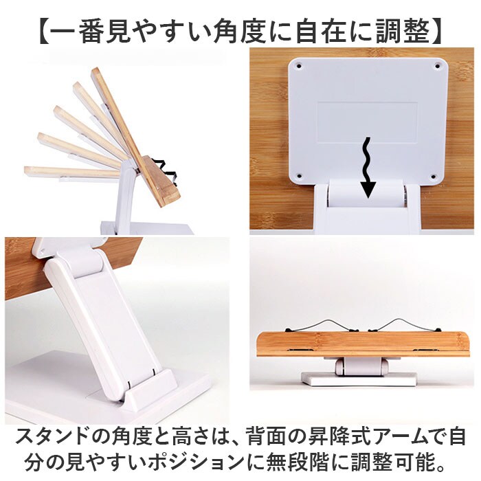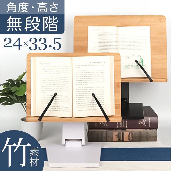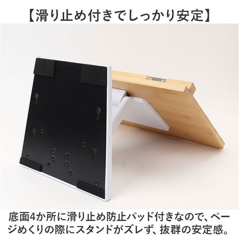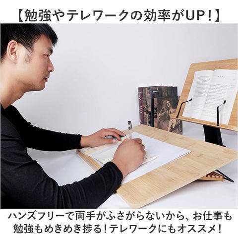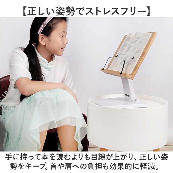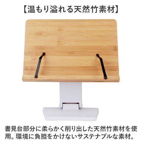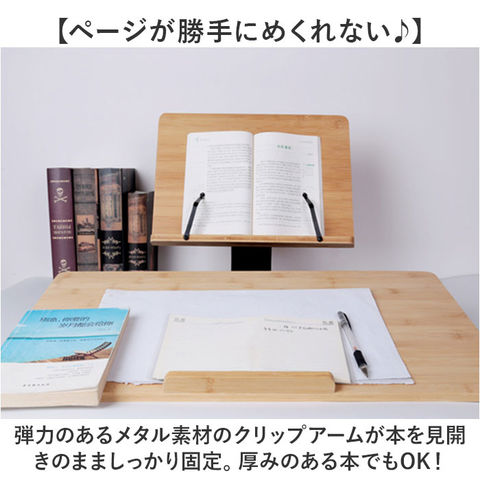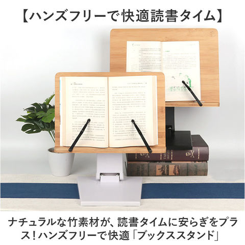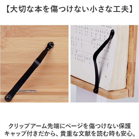 | 商品説明 | 【ハンズフリーで快適読書タイム】ナチュラルな竹素材が、読書タイムに安らぎをプラス!ハンズフリーで快適「ブックススタンド」【一番見やすい角度に自在に調整】スタンドの角度と高さは、背面の昇降式アームで自分の見やすいポジションに無段階に調整可能。【ページが勝手にめくれない♪】弾力のあるメタル素材のクリップアームが本を見開きのまましっかり固定。厚みのある本でもOK!【大切な本を傷つけない小さな工夫】クリップアーム先端にページを傷つけない保護キャップ付きだから、貴重な文献を読む時も安心。【正しい姿勢でストレスフリー】手に持って本を読むよりも目線が上がり、正しい姿勢をキープ。首や肩への負担も効果的に軽減。【滑り止め付きでしっかり安定】底面4か所に滑り止め防止パッド付きなので、ページめくりの際にスタンドがズレず、抜群の安定感。【勉強やテレワークの効率がUP!】ハンズフリーで両手がふさがらないから、お仕事も勉強もめきめき捗る!テレワークにもオススメ!【折りたたんでサッと持ち運び】昇降式アームを折りたたんでフラットな形状に変身。書斎やリビング等どこへでも持ち運び自在。【温もり溢れる天然竹素材】書見台部分に柔らかく削り出した天然竹素材を使用。大気中の二酸化炭素を吸収しながら短期間で成長し、環境に負担をかけないサステナブルな素材。【使うほどに深まる味わい】明るい木肌が使い込むほどにツヤのある飴色へ表情を変え、経年変化が楽しめるのも魅力のひとつ。【タブレット&スマホにも対応】タブレットを立て掛ければ動画視聴もより快適に。レシピ動画を見ながらのお料理もグッと楽に。【自分スタイルでリラックス】頬杖を突いたり、片手にカップを持ちながらでもOK!読書が自分スタイルで楽しめる便利アイテム。 |