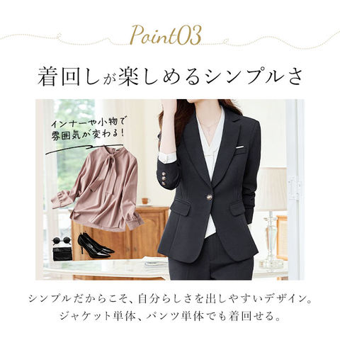 | 商品説明 | 【通勤やフォーマルシーンで活躍】まわりとちょこっと差を付けて、スタイリッシュにキマる♪レディース用「ビジネススーツ」。【上品なキレイめスタイルが完成】きちんと感のあるジャケット&パンツ。シンプルながら、ディテールにアクセントをプラス。【すっきりフォルムのジャケット】肩パッドでシルエットをキープ&エレガントなラペルデザイン。スリムに魅せる絶妙な仕立て♪【ベーシックなシングルタイプ】フロントボタンを1つ配置し、スマートな印象を演出。左右にはフラップポケットを。(※)胸元ポケットとチーフはフェイクです。【シンプルなストレートパンツ】すっと落ちて足元スラリ。フロントファスナー&ボタンで着脱でき、片側にミニポケット付き。【ロングシーズン使える万能アイテム】薄すぎず厚すぎない程よい生地感。ジャケットは裏地付で着用時のムレを軽減、摩擦からも保護。【インナー次第で魅せ方が広がる】襟なしトップスや、デザイン性のあるブラウスもマッチ。シーンに合わせて楽しめる☆【お子さまの学校行事にもおすすめ】フォーマルシーンにも馴染むデザイン。お子さまの入学・卒業式への参加もOK! |