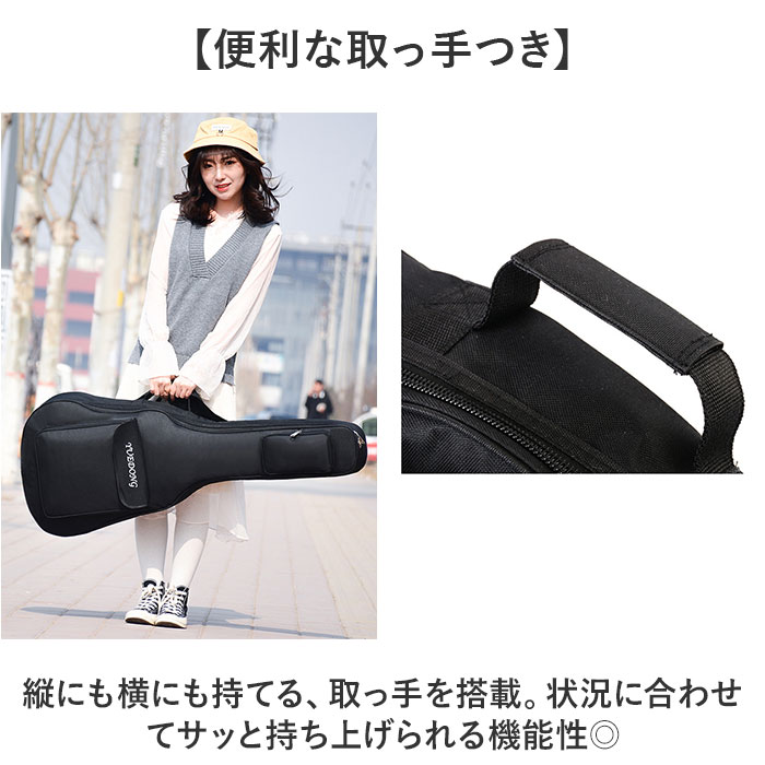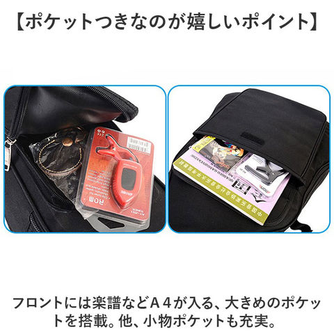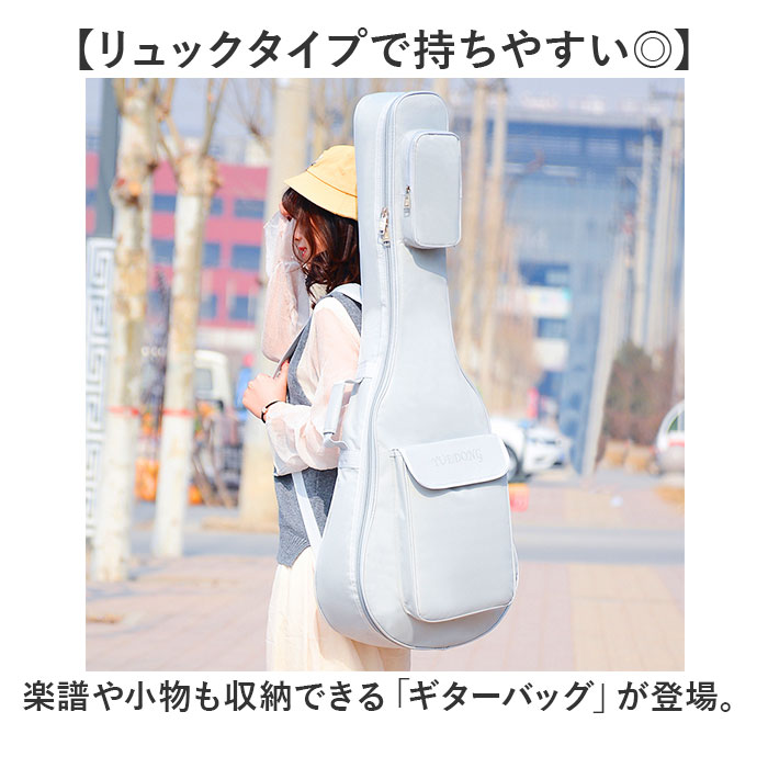 | 商品説明 | 【リュックタイプで持ちやすい◎】楽譜や小物も収納できる「ギターバッグ」が登場。【ハンズフリーで移動ができる!】リュックタイプなので、大きいギターも簡単に持ち運び!両手が空くから他の荷物を持つことも◎【ポケットつきなのが嬉しいポイント】フロントには楽譜などA4が入る、大きめのポケットを搭載。他、小物ポケットも充実。【固定バンドつきで安心】ギターを固定してくれる、面ファスナー仕様のバンドをプラス。収納のしやすさもGOOD。【便利な取っ手つき】縦にも横にも持てる、取っ手を搭載。状況に合わせてサッと持ち上げられる機能性◎【誰にでも似合う、シンプルデザイン】性別年齢を問わずに持てる、ベーシックデザイン☆飽きが来ないから長く使える!【ポケット仕様】フロント:ファスナーポケット×1、面ファスナーポケット×1 |