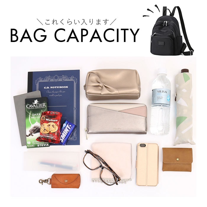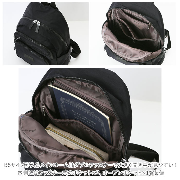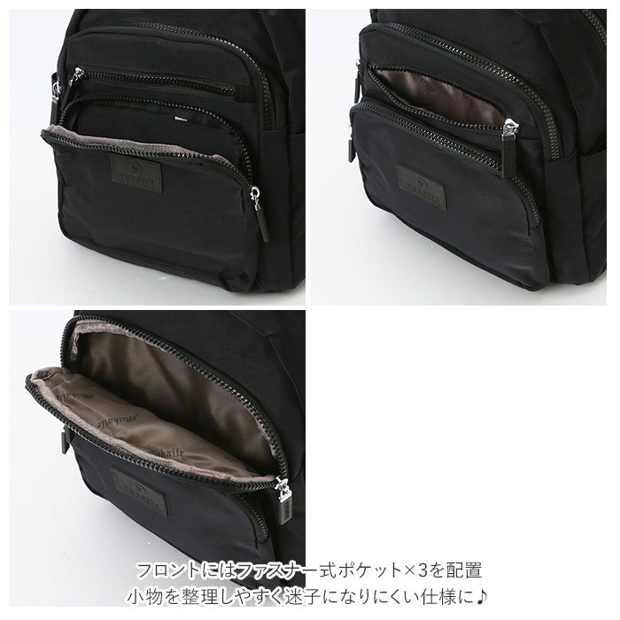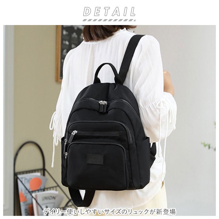 | 商品説明 | デイリー使いしやすいサイズのリュックが新登場。B5サイズが入るメインルームはダブルファスナーで大きく開き中が見やすい!内側にはファスナー式のポケット×2、オープンポケット×1を装備。フロントにはファスナー式ポケット×3、両サイドにはオープンポケット×2を配置。小物を整理しやすく迷子になりにくい仕様に♪背面には長財布を縦に入れられるセキュリティーポケット付き。撥水加工も施してあり水滴や汚れが付いてもサッと拭き取れる。普段使いはもちろん旅行のサブバッグとしてもおススメ。 |