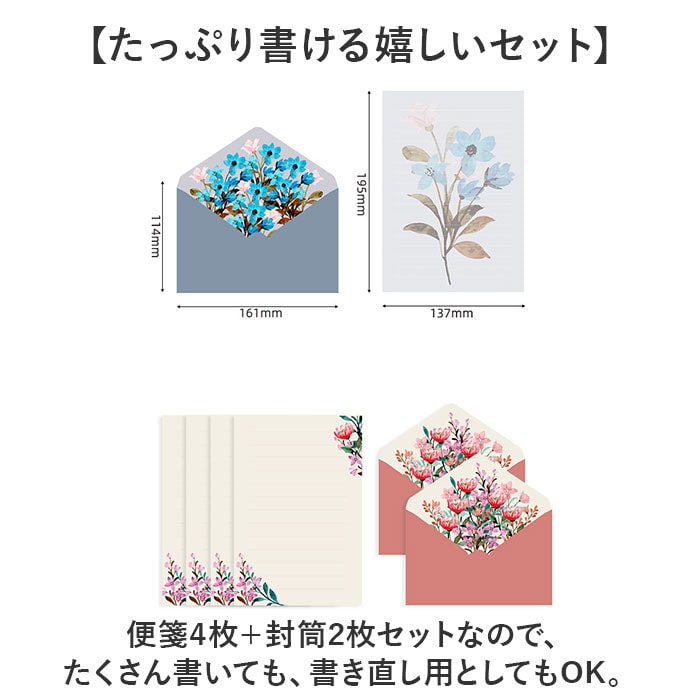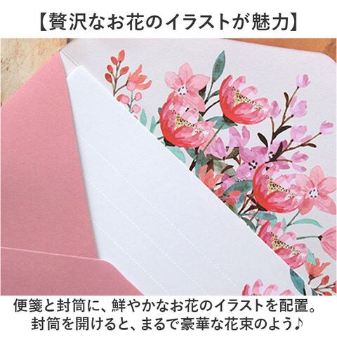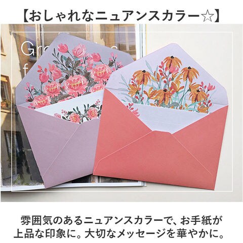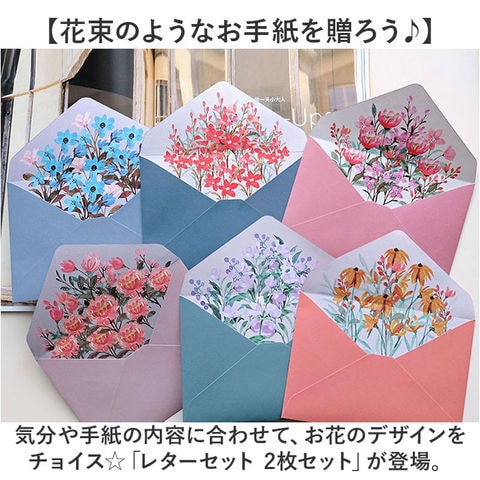 | 商品説明 | 【花束のようなお手紙を贈ろう♪】気分や手紙の内容に合わせて、お花のデザインをチョイス☆「レターセット 2枚セット」が登場。【贅沢なお花のイラストが魅力】便箋と封筒に、鮮やかなお花のイラストを配置。封筒を開けると、まるで豪華な花束のよう♪【おしゃれなニュアンスカラー☆】雰囲気のあるニュアンスカラーで、お手紙が上品な印象に。大切なメッセージを華やかに。【たっぷり書ける嬉しいセット】便箋4枚+封筒2枚セットなので、たくさん書いても、書き直し用としてもOK。【書く楽しみ、開く楽しみ☆】お気に入りの便箋に書く楽しみ、開けてびっくりの花束☆書く人も受け取る人もハッピーに! |