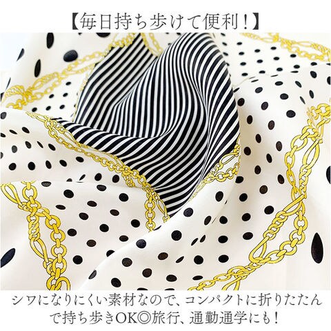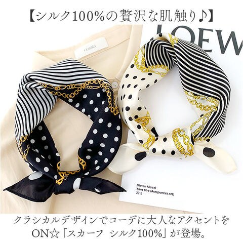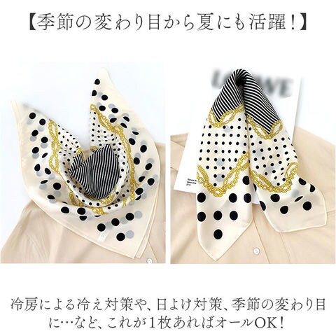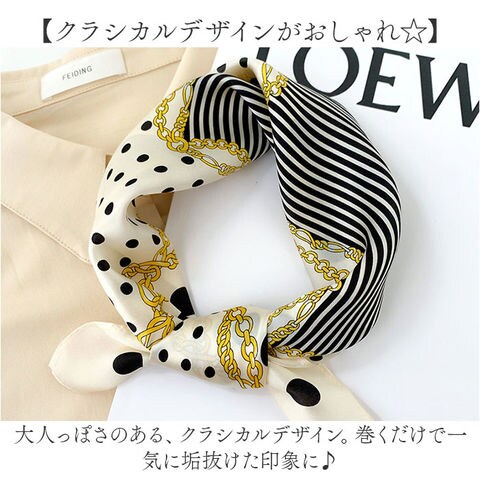 | 商品説明 | 【シルク100%の贅沢な肌触り♪】クラシカルデザインでコーデに大人なアクセントをON☆「スカーフ シルク100%」が登場。【シルク100%でサラっと気持ちいい】シルクを100%使用した、贅沢な肌触りが魅力。ほどよい光沢で高見えする、上品な1枚。【クラシカルデザインがおしゃれ☆】大人っぽさのある、クラシカルデザイン。巻くだけで一気に垢抜けた印象に♪【ちょうどいい大きさで巻きやすい】大きすぎないので、気軽にクルっと巻ける!首元やバッグのハンドルにつけるだけでこなれ感UP♪【毎日持ち歩けて便利!】シワになりにくい素材なので、コンパクトに折りたたんで持ち歩きOK◎旅行、通勤通学にも!【季節の変わり目から夏にも活躍!】冷房による冷え対策や、日よけ対策、季節の変わり目に…など、これが1枚あればオールOK! |