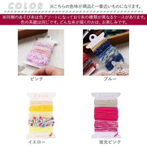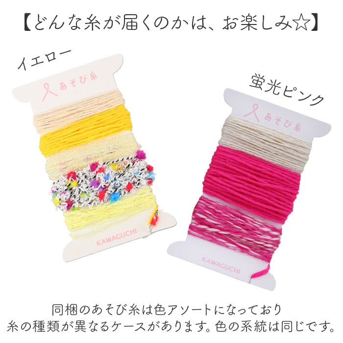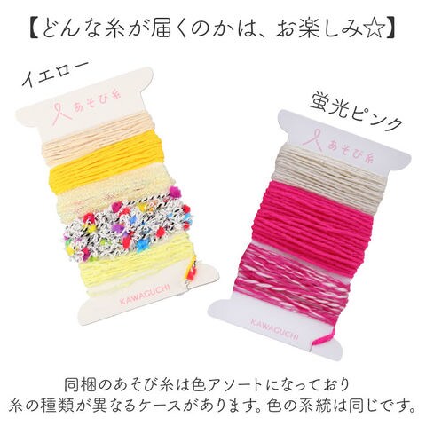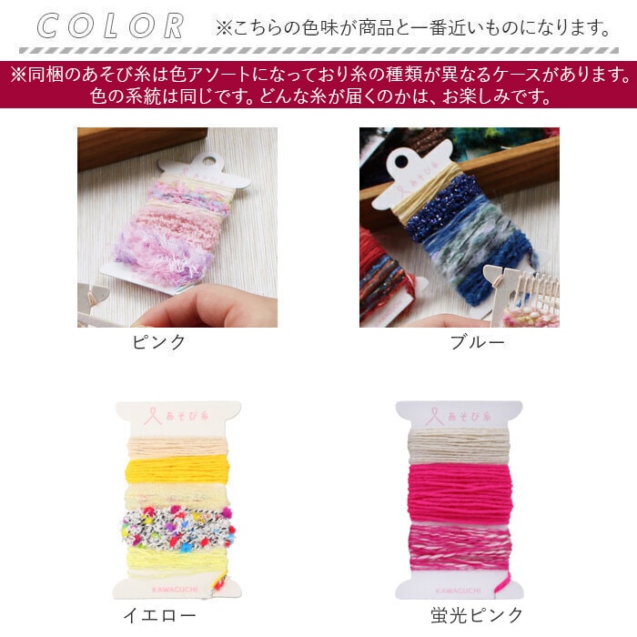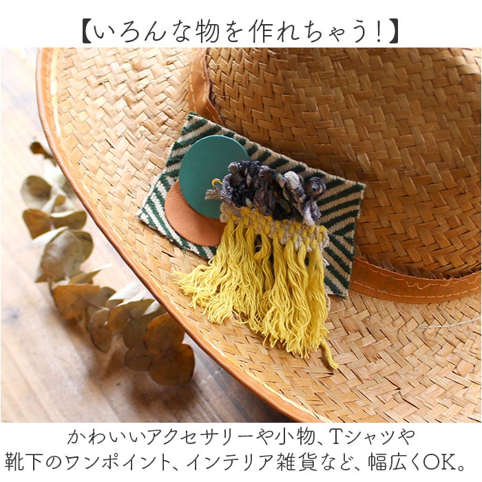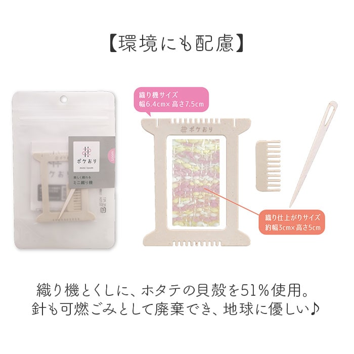 | 素材 | [織機本体・くし]ホタテ殻、ポリプロピレン [針]紙 [糸]この商品の糸は、様々のアパレル製品で使用されている残糸を再利用し組成表示が困難なため、不明とさせていただきます。 |
