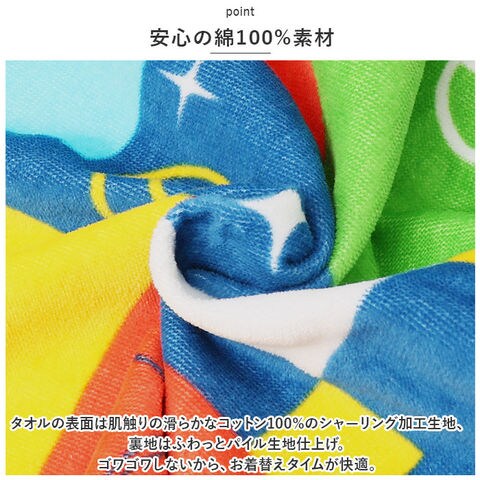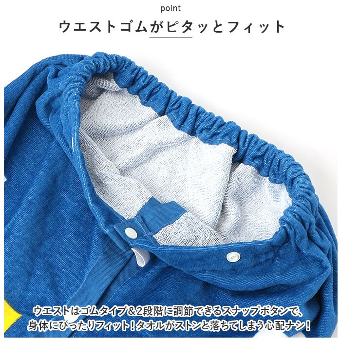 | 商品説明 | プールや海水浴のお着換えがとってもスムーズ!大人気キャラクターの絵柄が楽しい、キッズ向けプール用マキタオル(80cmタイプ)が新登場。【安心の綿100%素材】タオルの表面は肌触りの滑らかなコットン100%のシャーリング加工生地、裏地はふわっとパイル生地仕上げ。ゴワゴワしないから、お着替えタイムが快適。【プールや水遊び前のお着替えに】巻きタオルでくるっと身体を包みこんだら、タオルの中でサッとお着替え♪すっぽりと身体が隠れて、ひとりでのお着替えも慌てず安心!【ウエストゴムがピタッとフィット】ウエストはゴムタイプ&2段階に調節できるスナップボタンで、身体にぴったりフィット!タオルがストンと落ちてしまう心配ナシ!【きちんと閉まって安心】サイドも3ヶ所のスナップボタンできちんと留めることができるので、更衣室や教室でお友だちと一緒のお着換えも恥ずかしくない♪【バスタオルにしてもOK!】ほどよい吸水力のあるコットン素材で、お着換えの後は身体を拭くバスタオルとしてはもちろん、ヘアドライ用にも最適!【ご家庭で簡単お洗濯!】洗濯ネットに入れて優しくお洗濯すれば、毎日のお手入れもラクラク。(※色落ちや毛羽落ちしますので、他のものと別にお洗濯してください。)【壁掛けループ&ネームタグ付き】ウエストの端に、壁掛けフックに掛けられるループ付き。裾にはネームタグも付いているので、お友だちとお揃いの柄でも大丈夫。【夏リゾートが楽しくなるデザイン】大人気キャラクターと一緒なら、お着替えがもっと楽しく!男の子も女の子も、お気に入りのキャラクターがきっと見つかる♪ |