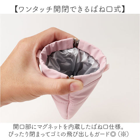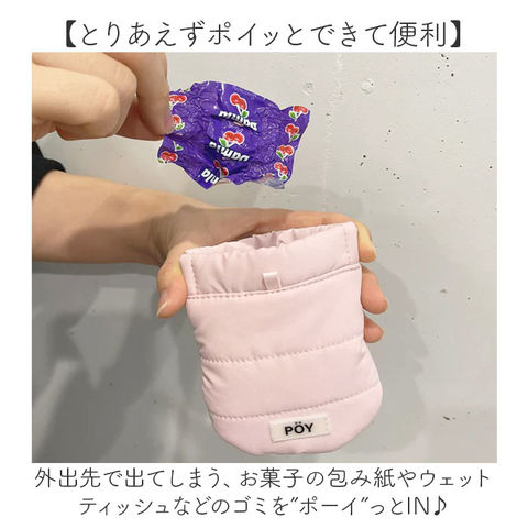 | 商品説明 | 【外出時のゴミはそのまま持ち帰り】外出先でのちょっとしたゴミを入れる、携帯用ゴミ箱!「POY MINI PUFF」。【とりあえずポイッとできて便利】外出先で出てしまう、お菓子の包み紙やウェットティッシュなどのゴミを”ポーイ”っとIN♪【チャーム感覚で使える可愛らしさ】中綿入りのふんわりパファー素材に、キルティング加工を。薄型で丸みのある手のひらサイズ☆【ワンタッチ開閉できるばね口式】開口部にマグネットを内蔵したばね口仕様。ぴったり閉まってゴミの飛び出しもガード◎(※)口元のループとカラビナを持って、開閉することも可能です。【繰り返し使えてお手入れもラクラク】汚れやすい内側は引き出して水洗いしたり、除菌シート等で拭き取り。何度でも使えてエコ!【小物入れとしても使えて万能】携帯ゴミ箱としてだけでなく、ちょっとした小物を入れるポーチとしても重宝。【カラビナで簡単取り付けOK】バッグやキーリングに取り付けできる、カラビナリング付き。ミニバッグなどでも安心。【お気に入りを選べるカラー】落ち着きのあるベーシックカラーや、差し色をラインナップ。ギフトにもおすすめ。 |