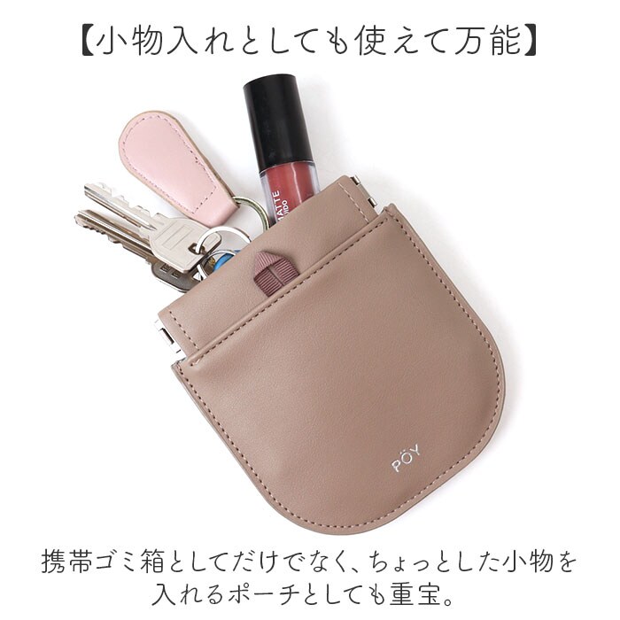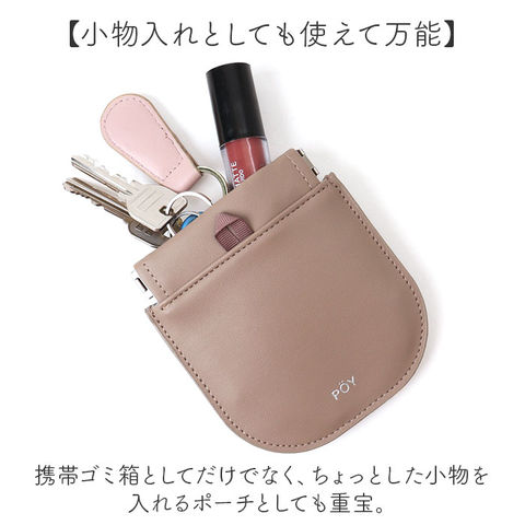 | 商品説明 | 【外出時のゴミはそのまま持ち帰り】外出先でのちょっとしたゴミを入れる、携帯用ゴミ箱!「POY MINI ROUND」。【とりあえずポイッとできて便利】外出先で出てしまう、お菓子の包み紙やウェットティッシュなどのゴミを”ポーイ”っとIN♪【丸みのある手のひらサイズ】柔らかな印象のラウンド形状&コンパクトサイズ。バッグの中でもかさばらないフラット形状。【ワンタッチ開閉できるばね口式】開口部にマグネットを内蔵したばね口仕様。ぴったり閉まってゴミの飛び出しもガード◎(※)口元のループとカラビナリングを持って、開閉することも可能です。【繰り返し使えてお手入れもラクラク】汚れやすい内側は引き出して水洗いしたり、除菌シート等で拭き取り。何度でも使えてエコ!【小物入れとしても使えて万能】携帯ゴミ箱としてだけでなく、ちょっとした小物を入れるポーチとしても重宝。【カラビナで簡単取り付けOK】バッグやキーリングに取り付けできる、カラビナリング付き。ミニバッグなどでも安心。【大人なスタイルに馴染むデザイン】落ち着きのあるレザー調の生地&温かみのあるカラー。通勤などのお供にも! |