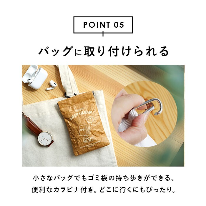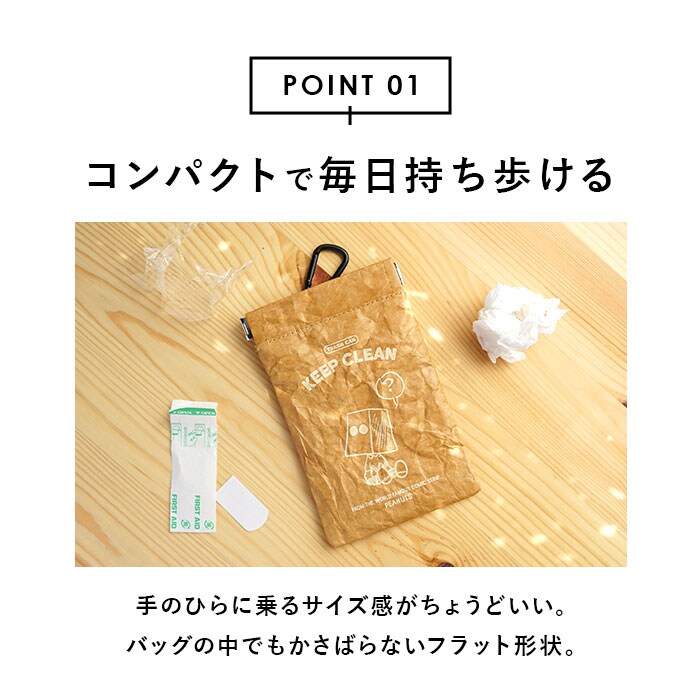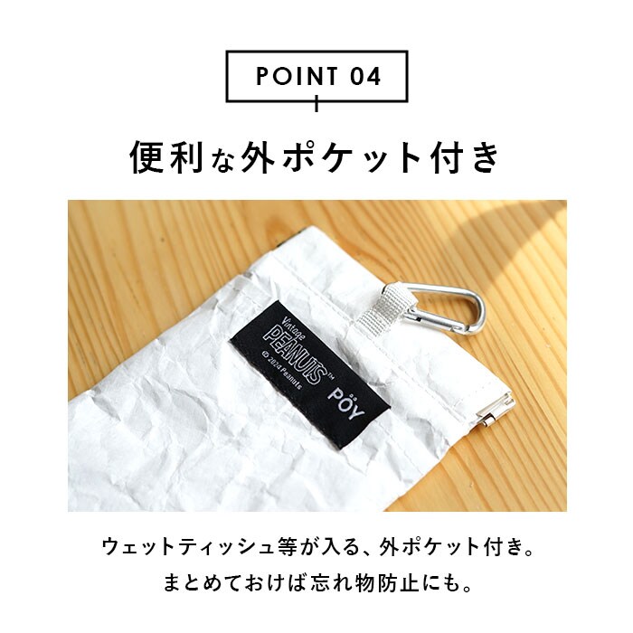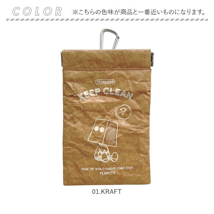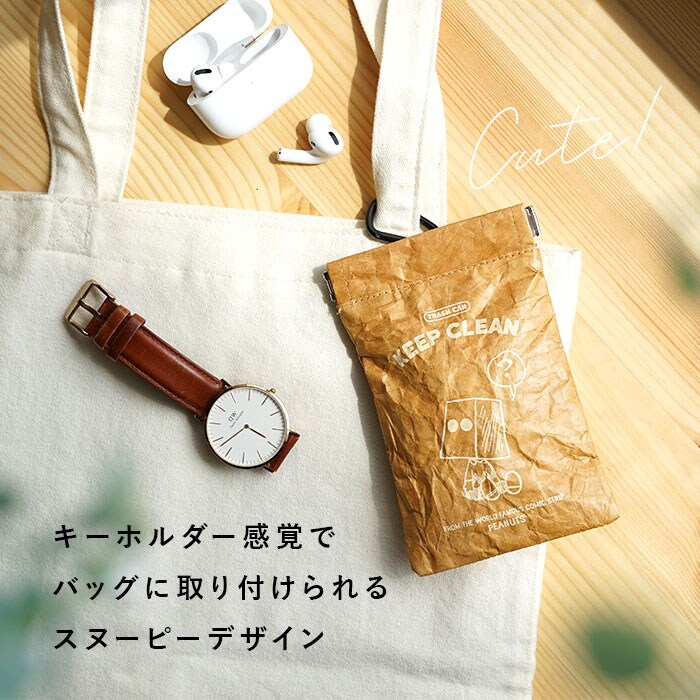 | 商品説明 | 【自分で出したゴミは自分で持ち帰り】外出先ででたちょっとしたゴミは、SNOOPYと一緒にきちんと持ち帰ろう!「POY TRASH PORCH」【POY(ポーイ)って何??】お菓子の包み紙やティッシュなど、小さなゴミを“ポーイ”と入れておくのに便利な携帯ミニゴミ箱。【とりあえず“ポーイ”の新習慣!】外出先で捨てる場所に困ったら、ポーチの中にポーイ!お家に帰ったら、中のゴミを捨てるだけ!【邪魔にならない手のひらサイズ】マチのない薄型フォルムとコンパクトな手のひらサイズで、カバンの片隅に入れて楽ラク持ち運び。【ばね口で、開け閉めスムーズ】ポーチの口元は、片手で簡単に開いてパタンッと閉じるばね口仕様だから、ゴミが飛び出さない♪【サッと拭けて、お手入れ楽ちん】汚れやすいポーチ内側は、アルコールシートでサッと拭けるシルバーコーティング生地を採用。【小物がちょこんと入るポケット付き】ポーチの背面に、ポケットティッシュやお手拭き用のウェットティッシュが入るポケット付き。【カラビナで肌身離さず持ち歩き】付属のカラビナで、普段使いのバッグのハンドルやDカンに取り付ければ、携帯に便利。【さまざまなシーンで大活躍】お子様とのお出掛けにはベビーカーにぶら下げて。ゴミ箱のないアウトドアシーンにもオススメ。【世界中で愛されるデザイン】すれ違う人が思わず振り返る!紙袋のようなクラフト素材にPEANUTSの絵柄を可愛らしくプリント。 |