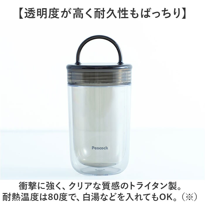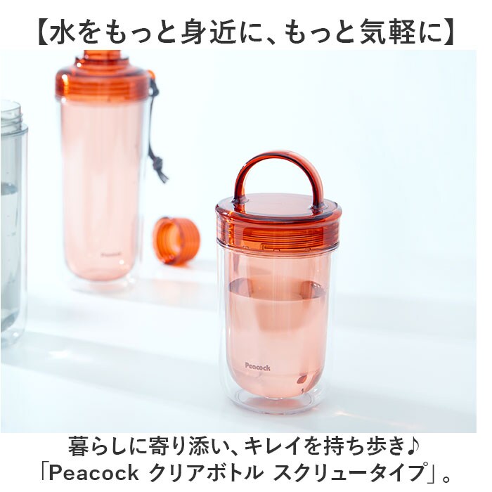 | 商品説明 | 【水をもっと身近に、もっと気軽に】暮らしに寄り添い、キレイを持ち歩き♪「Peacock クリアボトル スクリュータイプ」。【透明度が高く耐久性もばっちり】衝撃に強く、クリアな質感のトライタン製。耐熱温度は80度で、白湯などを入れてもOK。(※)熱湯を入れることは避けてください。【環境に配慮◎安心のBPAフリー】化学物質BPA不使用!小さなお子さまや妊娠中の方も安全に使えるのが嬉しい◎【デザイン性も機能性も抜かりなく】美しい浮遊感が特徴のダブルウォール仕様。外側の結露を防いで、まわりを濡らさず快適。【サッと水分補給できるスクリュー式】スムーズに開閉できるフタ。いつでもどこでもゴクゴク直飲みできるスクリュー式。【準備もお手入れもスムーズ】約6.6cmの広口タイプ。コップ感覚で底まで洗浄しやすく、サーバーからの給水なども簡単。【水分摂取量をしっかり管理】嬉しい目盛り付きで、摂取量をひと目で確認♪カラダ管理をされている方にもおすすめ。【ドリンク作りもラクラク対応】プロテインやデトックスウォーター作りに♪内側ボトルに印字されており、はがれる心配も不要。【サッと持ち出せる軽量設計】荷物にならず持ち運べる!取っ手付きで、オフィス用などにもちょうどいい容量340ml。【おしゃれなカラーリングも魅力】ヘルシーなブリックと、ブラックより抜け感のあるスモーク。家族で色違い揃えも☆ |
