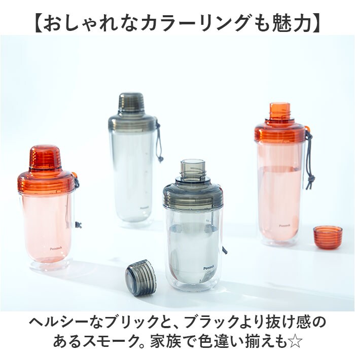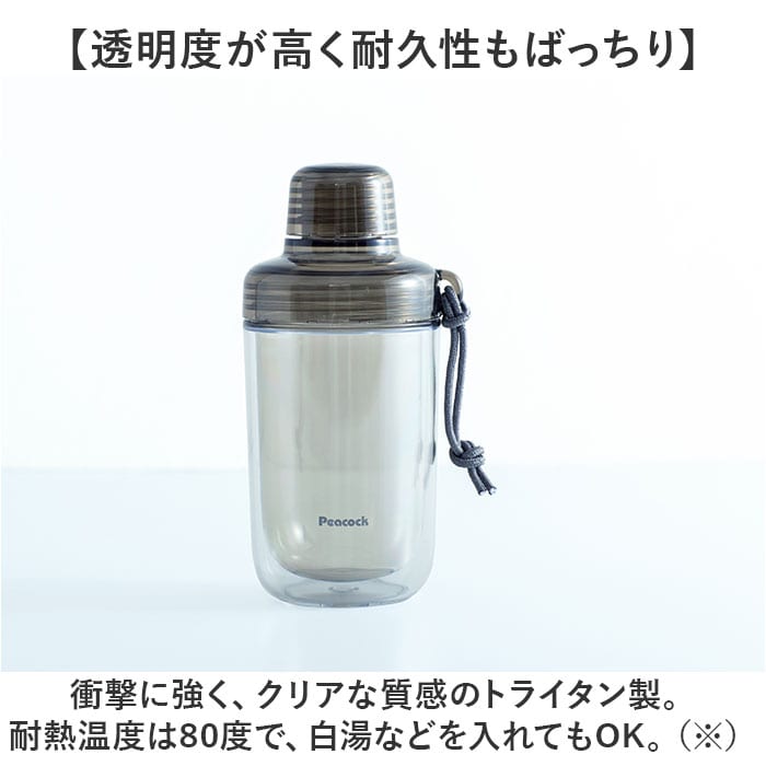 | 商品説明 | 【水をもっと身近に、もっと気軽に】暮らしに寄り添い、キレイを持ち歩き♪「Peacock クリアボトル キャップタイプ」。【透明度が高く耐久性もばっちり】衝撃に強く、クリアな質感のトライタン製。耐熱温度は80度で、白湯などを入れてもOK。(※)熱湯を入れることは避けてください。【環境に配慮◎安心のBPAフリー】化学物質BPA不使用!小さなお子さまや妊娠中の方も安全に使えるのが嬉しい◎【デザイン性も機能性も抜かりなく】美しい浮遊感が特徴のダブルウォール仕様。外側の結露を防いで、まわりを濡らさず快適。【ゴクゴク飲めるキャップタイプ】スムーズに開閉できるキャップ式。滑らかな口当たりで、サクッと直飲み。【準備もお手入れもスムーズ】約6.6cmの広口タイプ。コップ感覚で底まで洗浄しやすく、サーバーからの給水なども簡単。【水分摂取量をしっかり管理】嬉しい目盛り付きで、摂取量をひと目で確認♪カラダ管理をされている方にもおすすめ。【ドリンク作りもラクラク対応】プロテインやデトックスウォーター作りに♪内側ボトルに印字されており、はがれる心配も不要。【サッと持ち出せる軽量設計】荷物にならず持ち運べる!ストラップ付きで、オフィス用などにもちょうどいい容量340ml。【おしゃれなカラーリングも魅力】ヘルシーなブリックと、ブラックより抜け感のあるスモーク。家族で色違い揃えも☆ |