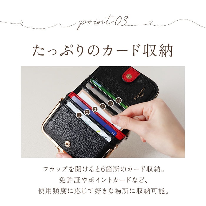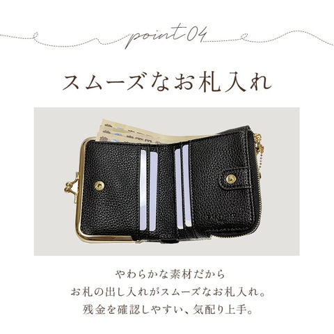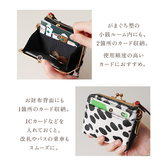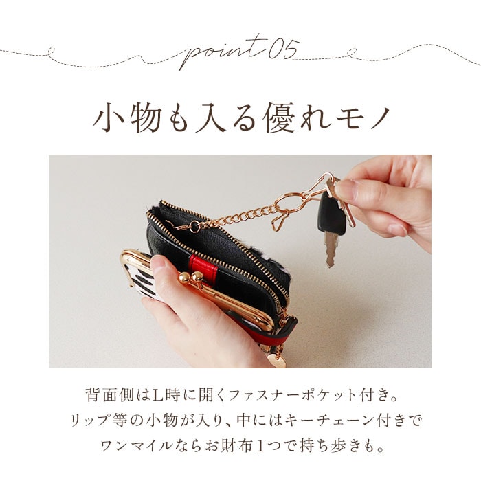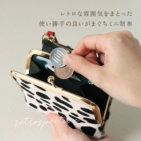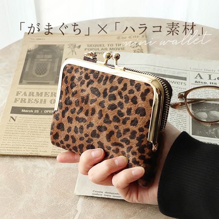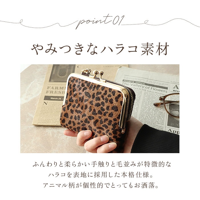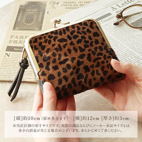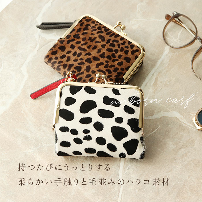 | 商品説明 | 【ユニークなアニマル柄が特徴】アニマルデザインが大人カワイイ♪がま口二つ折りミニウォレット。【ハラコ素材】柔らかい手触りと毛並みが特徴的なハラコを表地に採用した本格仕様!【レトロさもあるがま口】丸みのあるフォルムとレトロ感のあるがま口仕様のコインケース。【見た目だけでなく実用性も】がま口は見た目だけでなく、ガバッと大きく開くので小銭の出し入れもラクラク♪【カードもお札も入る】コンパクトな見た目ながら、カード入れやお札入れを設けメインのお財布として使える収納力◎【鍵の収納も可能】サイドのファスナーポケットにはキーフックを搭載し、家や車の鍵もサッと取り出せる仕様に。【駅の改札もスムーズに♪】背面のアウトポケットにICカードを収納しておけば、改札やバス乗車時もワンタッチでOK。【カバンを選ばない】ミニバッグやアウターのポケットにも収納できる、コンパクトさも嬉しいポイント。【ポケット仕様】[フラップ内]・・・カード入れ×6[お札入れ]・・・カード入れ×1[がま口小銭入れ]・・・カード入れ×2[ファスナーポケット]・・・オープンポケット×2、キーフック×1[背面]・・・オープンポケット×1 |