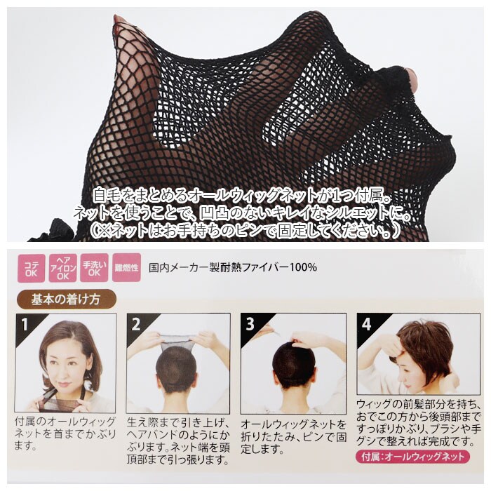 | 注意点 | [付属品]オールウィッグネット x 1個お取り扱いの際は、商品やパッケージなどに記載されている品質表示、アテンションタグ、ご使用上の注意事項などを必ずご確認下さい。本来の目的以外にはご使用にならないで下さい。カメラやモニターの性質により、画像と実物の色の違いがある場合がございますのでご理解願います。 |