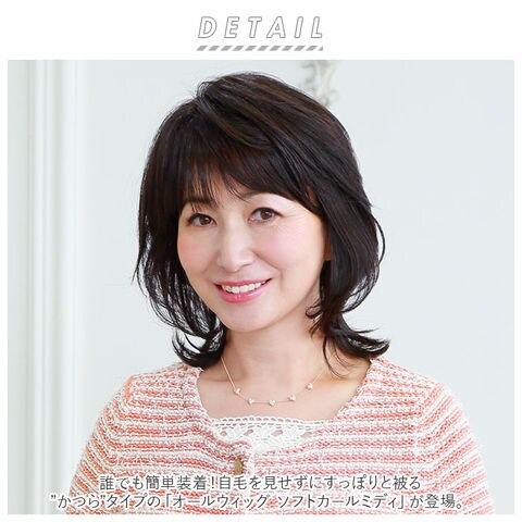 | 商品説明 | 誰でも簡単装着!自毛を見せずにすっぽりと被る”かつら”タイプの「オールウィッグ ソフトカールミディ」が登場。自毛をまとめるオールウィッグネットが1つ付属。ネットを使うことで、凹凸のないキレイなシルエットに。(※ネットはお手持ちのピンで固定してください。)ネットで自毛をまとめたら、帽子のようにすっぽりとウィッグを被ってスタイリングするだけ!柔らかな曲線を描くミディアムヘアが完成♪伸縮性&通気性に優れたフルメッシュキャップ仕様!こめかみ部分にワイヤーが入っているので、顔まわりに沿いやすく浮きにくいのがポイント。襟足部分にサイズ調節可能なアジャスター付き。しっかり固定することで頭にフィットし、安定感もばっちり。人工スキン部分は、より本物に近い頭皮の質感を表現!日本製の耐熱ファイバーを使用し、ツヤを軽減した人毛のような細さがウィッグに見えない自然なスタイルを演出!コテやヘアアイロンの使用もOK。(※耐熱温度は180度、適正温度は130~150度です。)絡みや汚れが気になったら手洗いできるから、いつも清潔。着用ポイントやお手入れ方法が書かれた説明書付き。ウィッグ初心者さんでも安心。保管や持ち運びに便利なクリアポーチが付属。ふんわり軽いカールが上品な印象を演出♪おしゃれを楽しむアイテムとしてはもちろん、医療用としても活躍。 |