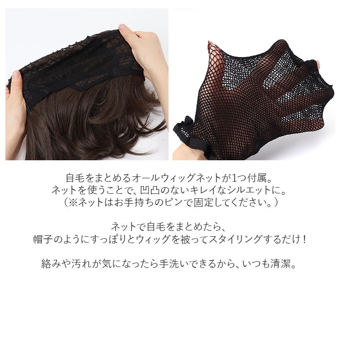 | 注意点 | [付属品]オールウィッグネット x 1個お取り扱いの際は、商品やパッケージなどに記載されている品質表示、アテンションタグ、ご使用上の注意事項などを必ずご確認下さい。本来の目的以外にはご使用にならないで下さい。カメラやモニターの性質により、画像と実物の色の違いがある場合がございますのでご理解願います。 |