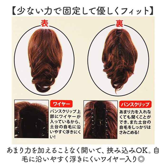 | 商品説明 | 【誰でも簡単!華やかさをプラス】簡単に使えるパーツウィッグ♪「プリシラ バンスウィッグ ナチュラルカール」。【クリップでサッとワンタッチ装着】自毛で作った土台の団子に、バンスクリップをカポッと挟むだけ。一瞬でスタイルチェンジ☆【少ない力で固定して優しくフィット】あまり力を加えることなく開いて、挟み込みOK。自毛に沿いやすく浮きにくいワイヤー入り◎【ふんわり大きめのカールが印象的】上品な印象でミセスにもおすすめ♪長すぎず短すぎない、程よい長さでデイリーに活躍。【人毛のような自然な質感とカラー】独自配合の国内メーカー製耐熱ファイバー100%。ツヤを軽減、くし通りも良く自毛に馴染む!(※1)凹凸加工を施した新ファイバーと、従来の耐熱ファイバーをミックスしています。【ヘアアイロンなどの使用も自由に】耐熱性があるので、コテやヘアアイロンの使用も可能。(※2)耐熱温度は180度、適正温度は130~150度です。【自宅でお手入れできて衛生的】絡みや汚れが気になったら手洗いできるから、いつも清潔をキープ。【ウィッグ初心者さんでも安心】セルフでサクッとアップスタイル!着用ポイントやお手入れ方法が書かれた説明書付き。 |