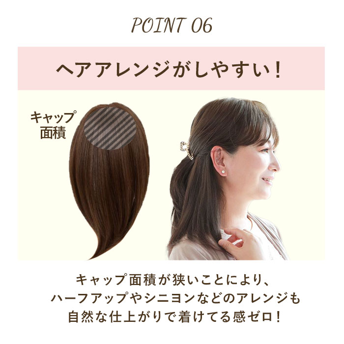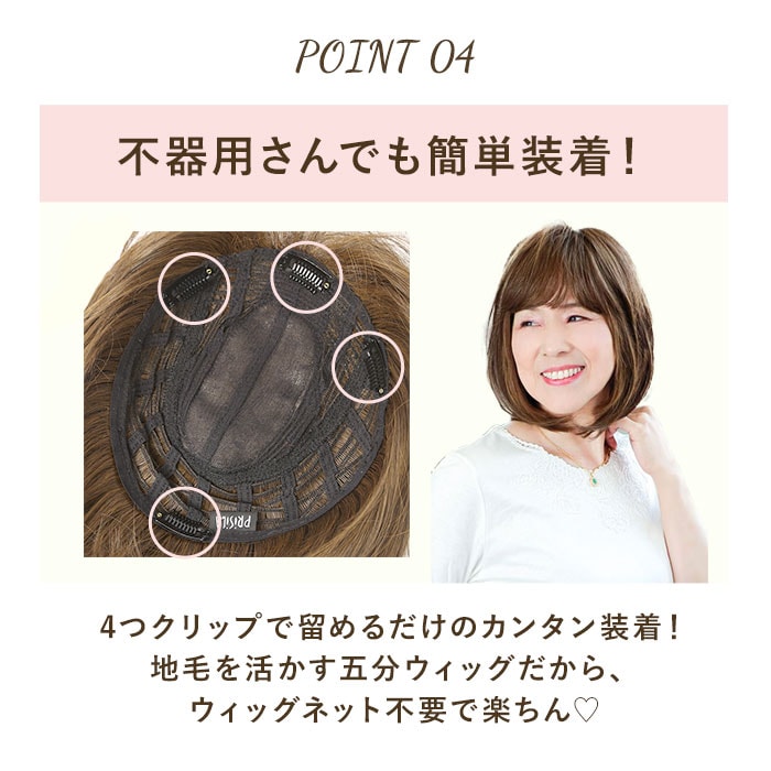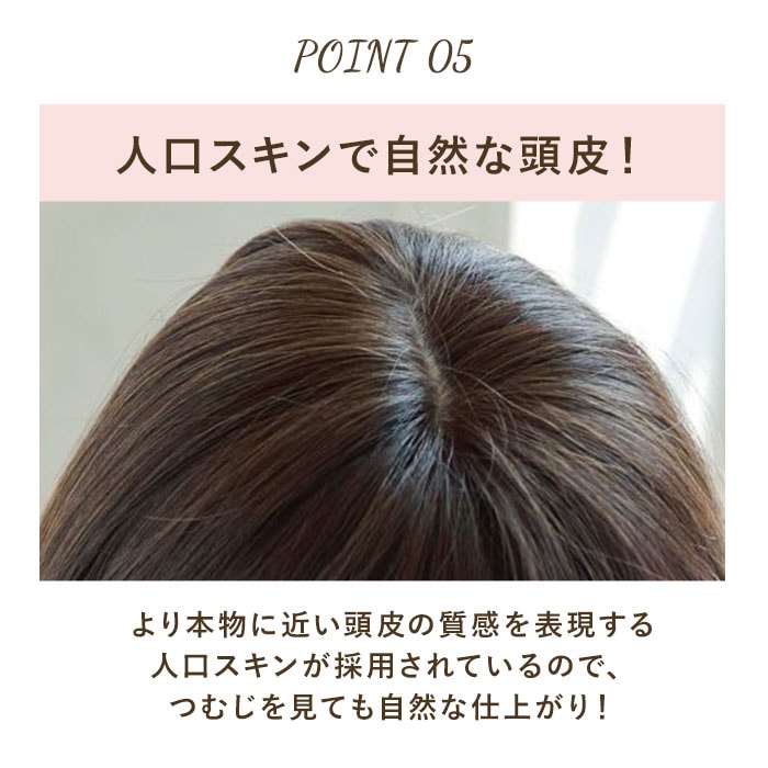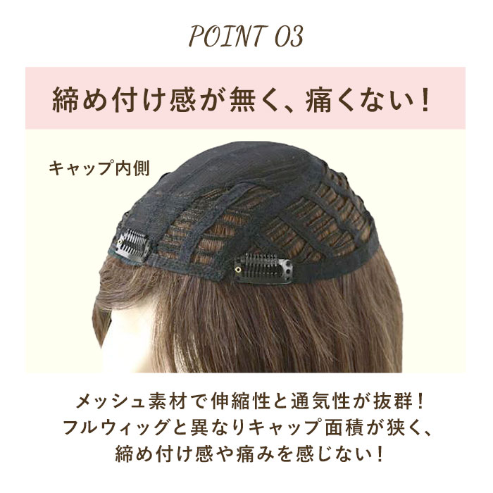 | 商品説明 | 透けない、割れない、痛くない!広範囲をカバーできる五分ウィッグ ニュアンスストレートが発売。オールウィッグには抵抗がある…つむじを広範囲でカバーしたいけれど、カバーピースだけでは不安…。そんな方にぴったり◎つむじからもみあげまでしっかり覆ってくれる五分ウィッグだから、安心感抜群!カバーピースでは足りない部分も透けることなくカバー。伸縮性&通気性に優れたフルメッシュキャップ仕様!ウィッグネット不要、4箇所のクリップで留めるだけのカンタン装着。オールウィッグのような締め付け感がなく、軽やかな付け心地。人工スキン部分は、より本物に近い頭皮の質感を表現!ツヤを軽減した人毛のような細さの耐熱ファイバー100%使用で、ウィッグに見えない自然なスタイルを演出。コテやヘアアイロンの使用もOK!絡みや汚れが気になったら、お手持ちのシャンプーを使って手洗いが可能。幅広い年代の方が使いやすい、ニュアンスストレートタイプ♪ |
