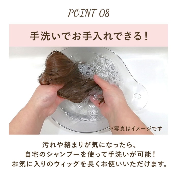 | 注意点 | 強いブラッシングは抜け毛の原因となりますのでお控えください。ウィッグに汚れが目立ち出したら早めにブラッシングやシャンプーをし、清潔に保つようにしてください。ウィッグをより長く保つために、市販のシャンプーではなくウィッグ専用のケア用品をおすすめします。シャンプーに液に長時間浸けることや、強いもみ洗い・押し洗いなどはおやめください。直射日光に当たる所、コンロや暖房器具のそば、車内など温度の高くなる場所に放置しないでください。小さな部品が含まれている商品がありますので、舐めたり口の中に入れたりしないでください。窒息の危険性があります。小さなお子様が使用される場合は保護者の監視のもとご使用ください。装着した状態で強く引っ張るなどの無理な負担をかけないでください。けがやウィッグ破損の原因となります。激しい運動時や就寝時に身につけていると、けがの原因となる場合がありますのでご注意ください。体質によりかぶれを生じる場合がありますので、異常を感じたときはご使用を中止し、皮膚科専門医にご相談ください。カメラやモニターの性質により、画像と実物の色の違いがある場合がございますのでご理解願います。 |