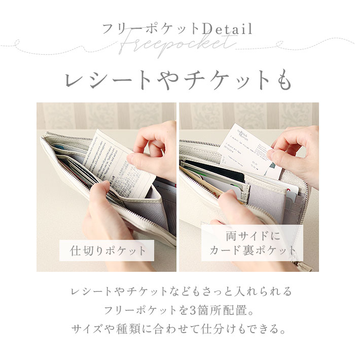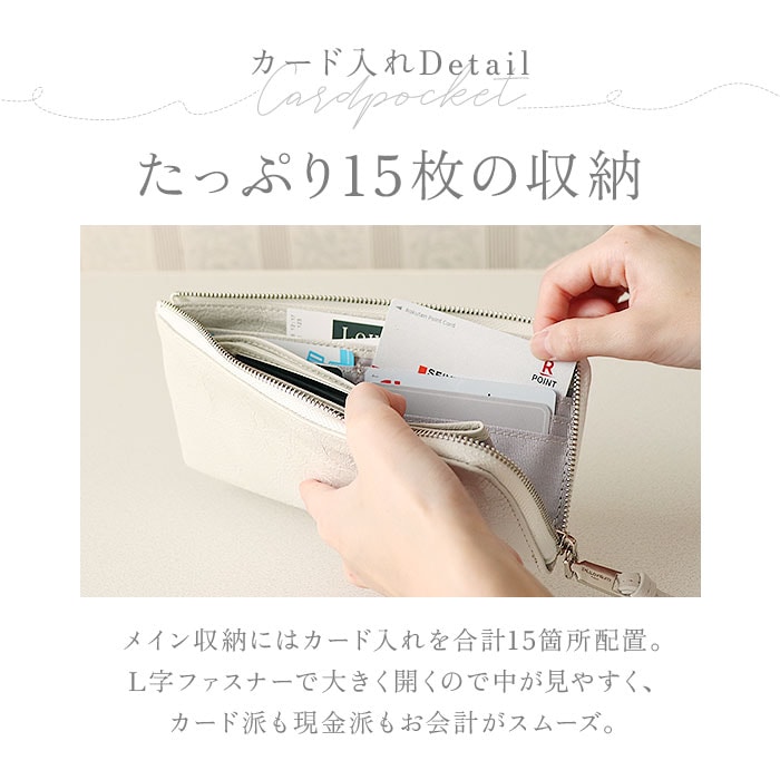 | 商品説明 | 【使いやすいスリムさ◎】カードがたくさん入るスリムウォレットがPisoraroから新発売♪【カードがたくさん入る】計15枚のカードが収納可能♪日ごろ使うカードはもちろん、診察券やポイントカードも収納!【背面から小銭を取り出せる◎】片マチ付きのファスナー式ポケットに小銭をIN。残金がひと目でわかり、お会計もスムーズ。【チケットや領収書も】レシートやチケットの収納できるフリーポケットや、小銭入れにも使える仕切りポケットも搭載。【フロントポケット付き】すぐに取り出したいチケット、さらにICカードを入れて置けばそのまま改札をスルー!【L字ファスナーでサッと開く】ガバッと大きく開くL字ファスナー構造。取り出しやすいのも嬉しいポイント。【かさばらないスリムさ】薄マチ構造で、カバンの中でかさばらないスリムさも魅力の一つ。【イージーケアでOK】合皮だから汚れても濡れても安心◎本革のように面倒なお手入れも不要♪※【ポケット仕様】メインルーム・・・カード入れ×15、仕切りポケット×1、フリーポケット×2フロント・・・オープンポケット×1背面・・・ファスナーポケット×1 |