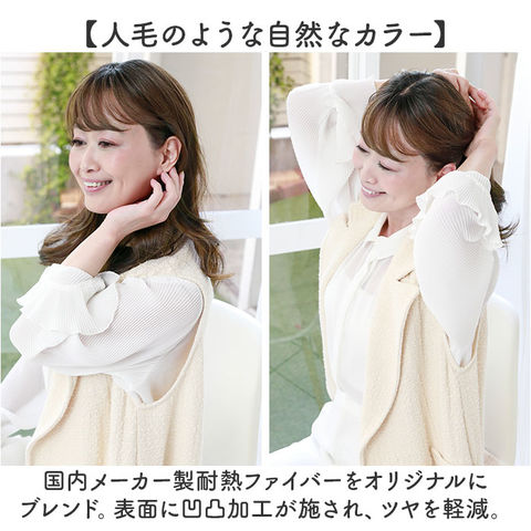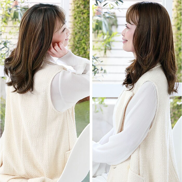 | 商品説明 | 【急なお出かけ前も簡単装着】毛染めまで待てない時のお助けアイテム!「プレミアム白髪かくしウィッグ ふんわりロング」。【手軽に使えるクリップタイプ】ウィッグをブラッシングし、カバーしたい部分に乗せてクリップで固定するだけ。【頭皮に優しくストレスフリー】裏側には頭皮に優しい、柔らかなネットを使用。肌を傷つけることなく快適な着用感。【頭皮の質感を表現した自然なつむじ】医療用ウィッグにも使用される、ごく薄いシルクスキン。真上からの視線も気にせず安心。【前髪の自然な立ち上がりを再現】前髪の生え際に手植えを施しているから、毛の立ち上がりがナチュラル。【ウィッグ特有の重さを軽減】量感を調整した軽やかな質感。自毛に馴染みやすいレイヤーがポイント。【しっかりカバー&ボリュームアップ】つむじ・分け目を広範囲にカバー。自然なボリュームアップも同時に叶うのが嬉しい♪【エイジレスに使えてアレンジ自在】オールマイティデザインとふんわり前髪で、女性らしい印象をプラス。毛足も長く、アレンジも!【人毛のような自然なカラー】国内メーカー製耐熱ファイバーをオリジナルにブレンド。表面に凹凸加工が施され、ツヤを軽減。【ヘアアイロンなどの使用も自由に】耐熱性があるので、コテやヘアアイロンの使用も可能。(※)耐熱温度は180度、適正温度は130~150度です。【自宅でお手入れできて衛生的】絡みや汚れが気になったら手洗いできるから、いつも清潔をキープ。【ウィッグ初心者さんでも安心】着用ポイントやお手入れ方法が書かれた説明書付き。 |