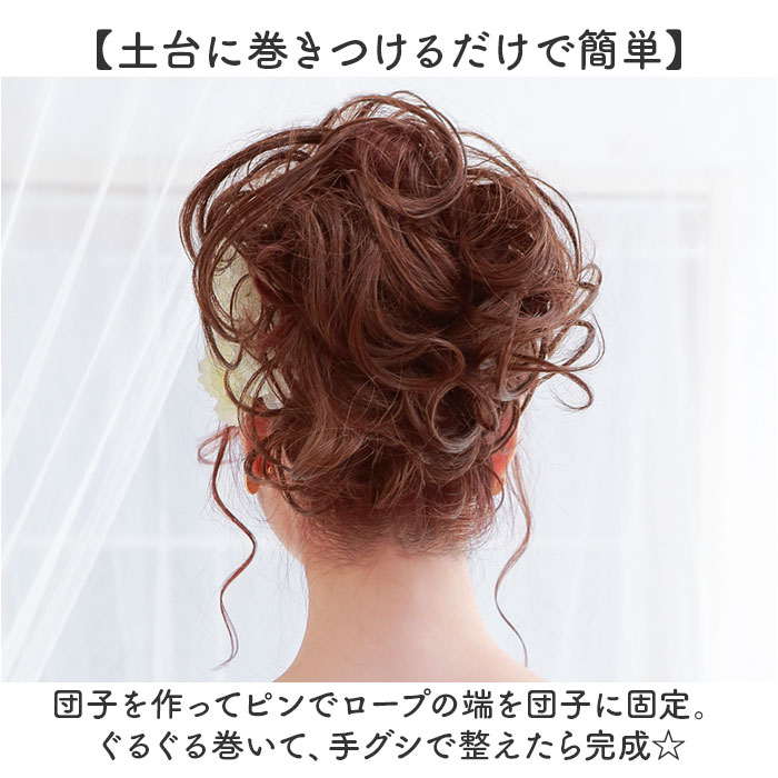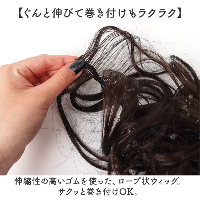 | 商品説明 | 【カールヘアで無限にアレンジ♪】簡単に使えるポイントウィッグ!「プリシラ ロープウィッグ グラマラスカール」。【土台に巻きつけるだけで簡単】団子を作ってピンでロープの端を団子に固定。ぐるぐる巻いて、手グシで整えたら完成☆【ぐんと伸びて巻き付けもラクラク】伸縮性の高いゴムを使った、ロープ状ウィッグ。サクッと巻き付けOK。【華やかでラグジュアリーなSカール】毛足の長いSカール。大人な雰囲気を演出し、お呼ばれスタイルにもぴったり。【洋装も和装も!色んなスタイルに】団子を好きな位置に作って、フェミニンなサイド盛り。高めの位置で着物用のアレンジも♪【人毛のような自然な質感とカラー】国内メーカー製耐熱ファイバー100%。ツヤを軽減し、自毛に馴染む仕上がりに。【ヘアアイロンなどの使用も自由に】耐熱性があるので、コテやヘアアイロンの使用も可能。(※)耐熱温度は180度、適正温度は130~150度です。【自宅でお手入れできて衛生的】絡みや汚れが気になったら手洗いできるから、いつも清潔をキープ。【ウィッグ初心者さんでも安心】どなたでも手軽にイメージチェンジ!着用ポイントやお手入れ方法が書かれた説明書付き。 |
