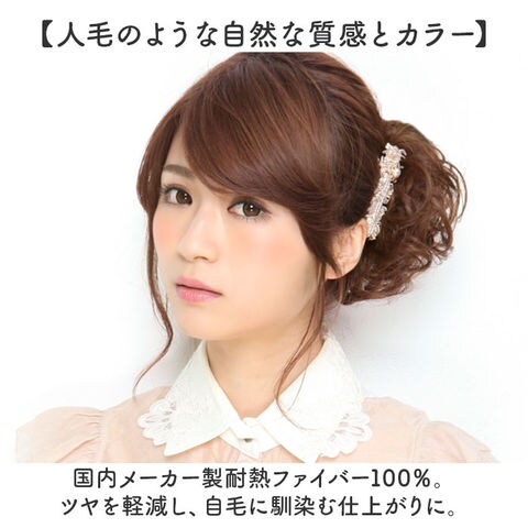 | 商品説明 | 【誰でも簡単!華やかさをプラス】簡単に使えるポイントウィッグ!「プリシラ シュシュウィッグ ラウンドカール」。【ヘアアクセ感覚のシュシュウィッグ】土台の団子を作ってはめるだけ。伸縮性のあるゴム状なので扱いやすく、不器用さんでも大丈夫。【パーティーに映えるラウンドカール】小さめのくるんとした定番カール♪上品な印象で、ドレススタイルに素敵にマッチ。【お好みでアレンジもできて便利】重ね付けしてふんわり見せてもOK!ボリュームアップもラクラク。【人毛のような自然な質感とカラー】国内メーカー製耐熱ファイバー100%。ツヤを軽減し、自毛に馴染む仕上がりに。【ヘアアイロンなどの使用も自由に】耐熱性があるので、コテやヘアアイロンの使用も可能。(※)耐熱温度は180度、適正温度は130~150度です。【自宅でお手入れできて衛生的】絡みや汚れが気になったら手洗いできるから、いつも清潔をキープ。【ウィッグ初心者さんでも安心】セルフでサクッとアップスタイル!着用ポイントやお手入れ方法が書かれた説明書付き。 |