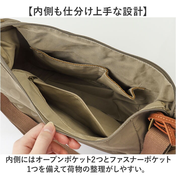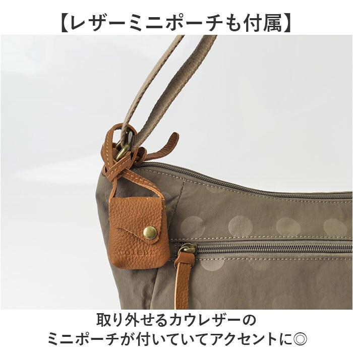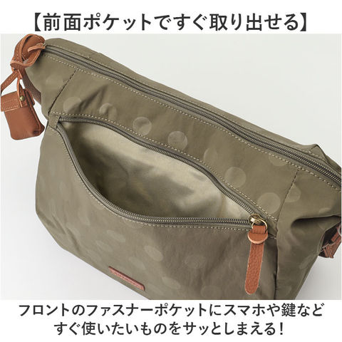 | 商品説明 | 【頼れる大きめ容量のバッグ】ドット柄が大人かわいい軽量バッグ「toleur ナイロンドットラージショルダー」。【軽くて撥水の頼れるナイロン】撥水加工のナイロン素材だから急な雨にも慌てず軽さも抜群で毎日の通勤にもぴったり♪【前面ポケットですぐ取り出せる】フロントのファスナーポケットにスマホや鍵などすぐ使いたいものをサッとしまえる!【内側も仕分け上手な設計】内側にはオープンポケット2つとファスナーポケット1つを備えて荷物の整理がしやすい。【レザーミニポーチも付属】取り外せるカウレザーのミニポーチが付いていてアクセントに◎ |
