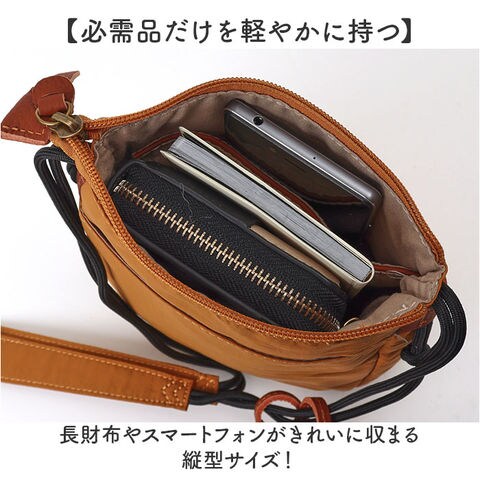 | 商品説明 | 【身軽にお出かけ】シワ感ナイロンとレザーが品よく馴染む大人のミニサコッシュ。【必需品だけを軽やかに持つ】長財布やスマートフォンがきれいに収まる縦型サイズ!【ナイロン×レザーの品格】ナイロン生地に牛革のパーツを合わせたデザイン。【すっきり縦型シルエット】見た目以上の収納力があり、内ポケットと外ポケットで整理も簡単◎【黒丸紐がアクセントに映える】細めの黒い丸紐ショルダーが全体を引き締め、カジュアルにもきれいめにも合わせやすい♪【安心の撥水加工】撥水加工が施されているから突然の雨でも中身をしっかり守ってくれる〇 |