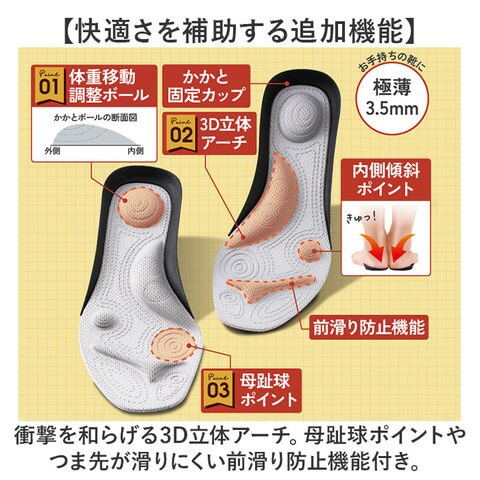 | 商品説明 | 【日々の歩行を快適にサポート】足裏から対策!専門家と共同開発した「パワースリム アクティブインソール」。【シューズに入れるだけの手軽さ】お手持ちの靴に忍ばせるだけでOK。シューズに馴染みやすい、厚みを抑えた設計。【内側傾斜で自然な重心移動を】外側から内側へ傾斜をつけた、かかとボール。内側を意識した重心移動をサポート。【快適さを補助する追加機能】衝撃を和らげる3D立体アーチ。母趾球ポイントやつま先が滑りにくい前滑り防止機能付き。【嫌なズレを防ぐかかと固定カップ】かかとに当たる部分にはカップを。優しく固定することで、心地よくフィット。【足裏に心地よさを提供するゲル】着地の衝撃を吸収するバウンドアクティブゲル。ソフトな肌当たりの3ポイントアクティブゲル。 |