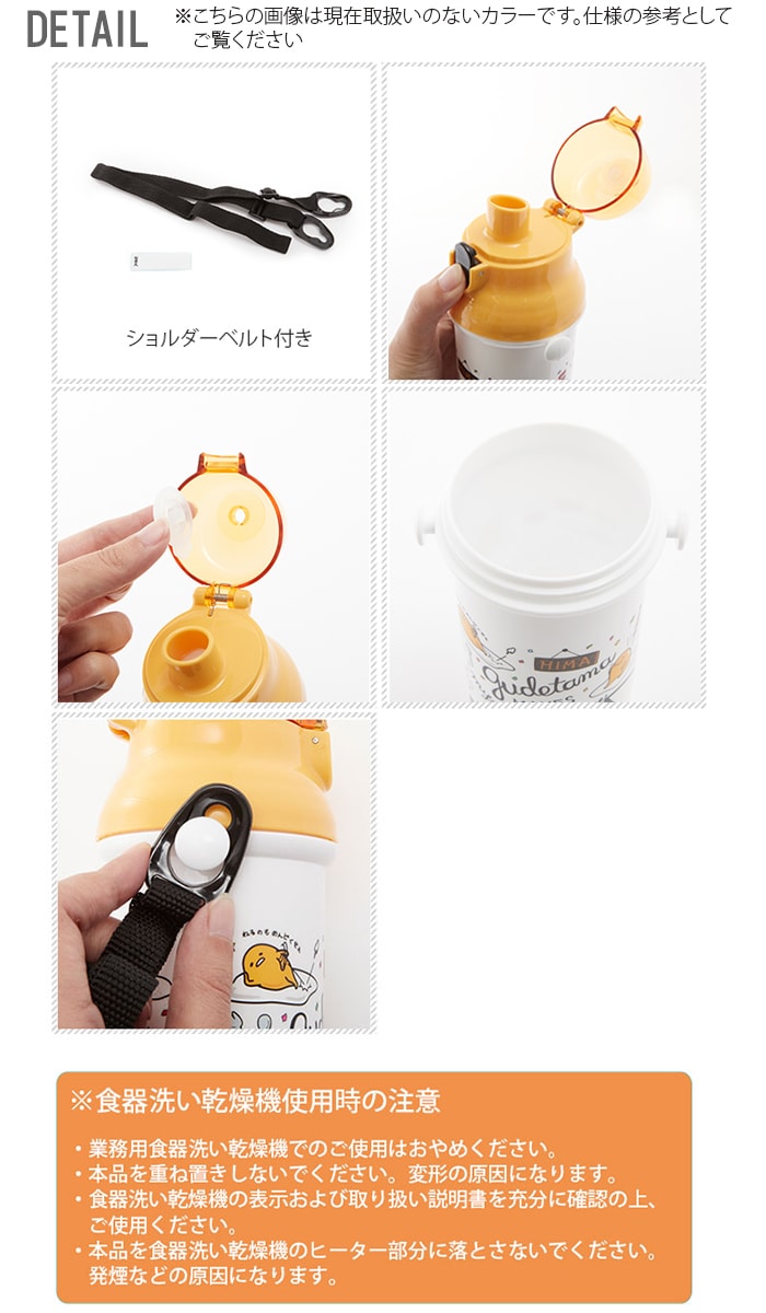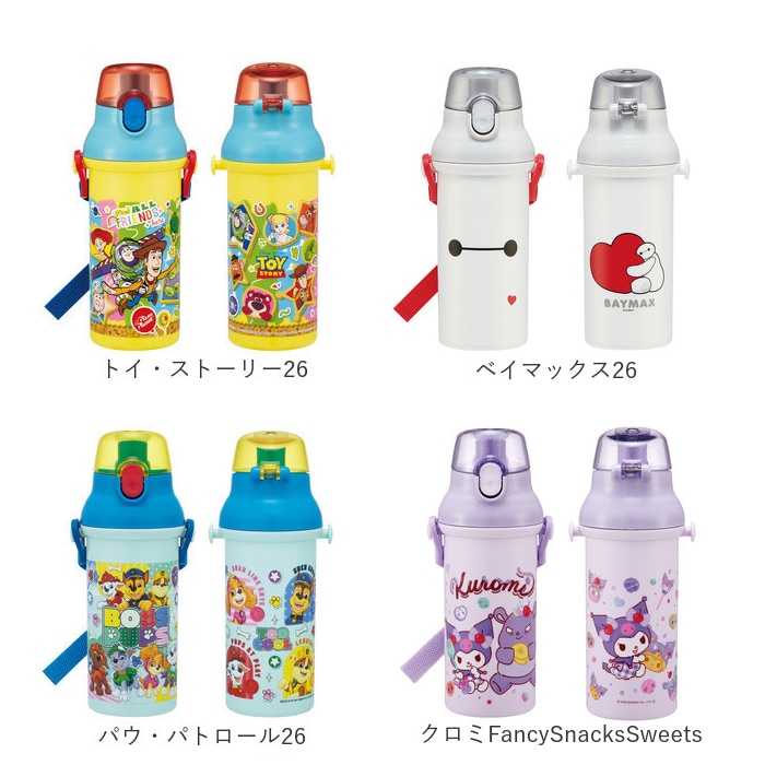 | 商品説明 | 人気キャラクターの絵柄がついた、プラスチックボトルです。保冷効果はありませんが、軽くて持ち歩きしやすいので、小さいお子さん用におすすめです。ワンプッシュで口がオープンするので、飲みたいときにサッと飲めます。フタ部分を回して取ると、広口なので氷を入れるのも洗うのもラクラクです。日本製、ショルダーベルト、名前シールつき。 |