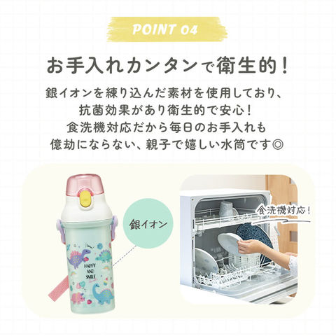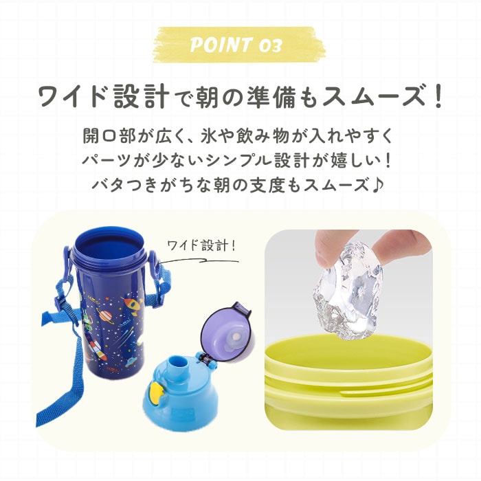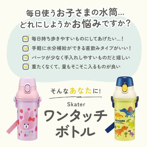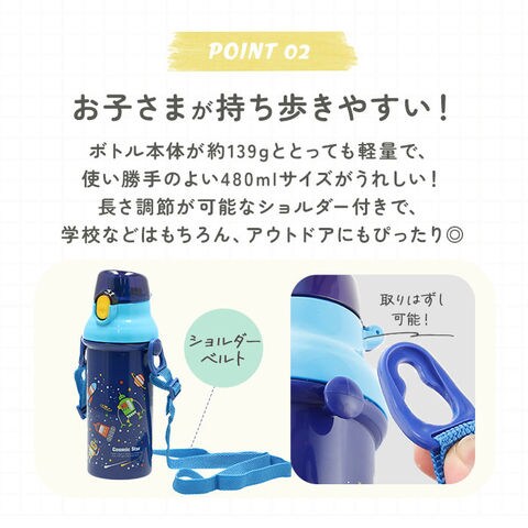 | 商品説明 | ショルダーベルトで簡単持ち運び!飲みたい時に手軽にそのまま飲める、直飲みタイプのワンタッチスポーツボトル!そのまま飲めるキャップユニットで、気軽に直飲みができるダイレクトタイプ。遠足や運動会など、のどの渇きをすぐに癒したい時にぴったり。キャップはワンプッシュで簡単オープン!飲み物を飲むときに、キャップが倒れてこないキャップロック機能付きで、ごくごく直飲みする時もキャップが顔に当たらない♪キャップユニットを外すと、ボトル開口部が広口になったワイド設計。飲み物に氷が入れやすく、忙しい朝も冷たい飲み物が手軽に準備できる。遠足やピクニックに出かける時もお子さまご自身で持ち運びがしやすい軽量ボトル!付属のショルダーベルトで肩掛けもOK!遠足など荷物が多い時にも、肩掛けにすれば両手が空くので、活発なお子さまにオススメ。ショルダーベルトは最長90cmまで伸長し、お子さまの成長に合わせて調節できる!リュックやカバンに入れて持ち運ぶときは取り外しも可能。お名前ネームシール付きで、お友達のボトルとの取り違えが防げる♪食器洗浄機対応で、洗い物の手間が少なくラクチン。ユニコーンやディノサウルスなど、男の子にも女の子にも人気の柄をバラエティ豊富に取り揃え、お気に入りが柄がきっと見つかる☆ |