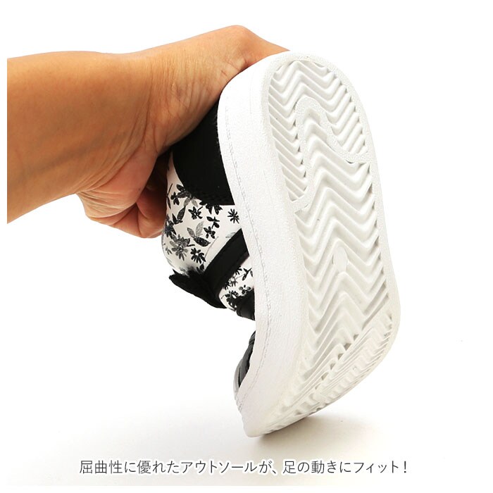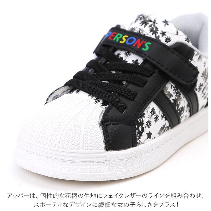 | 商品説明 | 小花を散りばめた“ゆめかわ”デザイン♪履きやすさを一番に考えた、PERSON’Sのキッズスニーカー。PERSON’Sのロゴが入った面ファスナーベルトで脱ぎ履きが楽ちん。さらに、伸縮ゴムタイプの靴ひもで、甲幅もピッタリサイズに簡単調節。裸足のように軽やかに走れる、片足約180gの軽量設計。(※16.0cmサイズ、片足分の重量です。)アッパーは、個性的な花柄の生地にフェイクレザーのラインを組み合わせ、スポーティなデザインに繊細な女の子らしさをプラス!付属の中敷きインソールは取り外しができ、こまめに水洗いが可能。いつも清潔で快適な履き心地。屈曲性に優れたアウトソールが、足の動きにフィット!さらに、履き口は厚みのあるクッションで仕上げて、靴擦れの痛みからキッズの足をガード。ソールの底面にはしっかりと溝が刻まれているので、滑りやすい雨の日でも安心。かかと部分には、自動車のライトにキラリと光るリフレクター素材を配置し、薄暗い時間も安全にお出掛け。PERSON’Sは「明るく、元気に、健康的に」のコンセプトのもと、1976年に渋谷の公園通りでスタートした老舗ブランド。ポップなカラーや楽し気なイラストをデザインに取り入れ、創設時と現代のトレンドをミックスさせたカジュアルラインを展開。 |