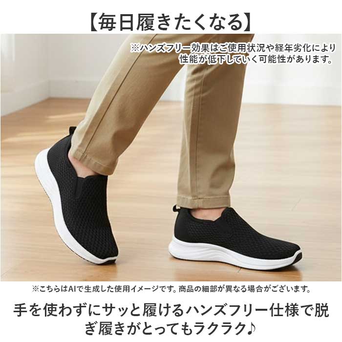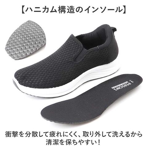 | 商品説明 | 【ハンズフリーで楽々】立ったまま履ける、「PERSONS」からメンズスニーカーが登場。【毎日履きたくなる】手を使わずにサッと履けるハンズフリー仕様で脱ぎ履きがとってもラクラク♪(※ハンズフリー効果はご使用状況や経年劣化により性能が低下していく可能性があります。)【幅広ゆったり設計】ゆったりとした幅広設計で足を優しく包み込み窮屈感のない快適な履き心地〇【通気性抜群メッシュ】アッパーには通気性に優れたメッシュ素材を使用し蒸れを防いで一日中快適な状態をキープ◎【ハニカム構造のインソール】衝撃を分散して疲れにくく、取り外して洗えるから清潔を保ちやすい!【屈曲性が良く歩きやすい】アウトソールは屈曲性が良く足の動きにフィット!スポーツからカジュアルまで幅広く使える。 |
