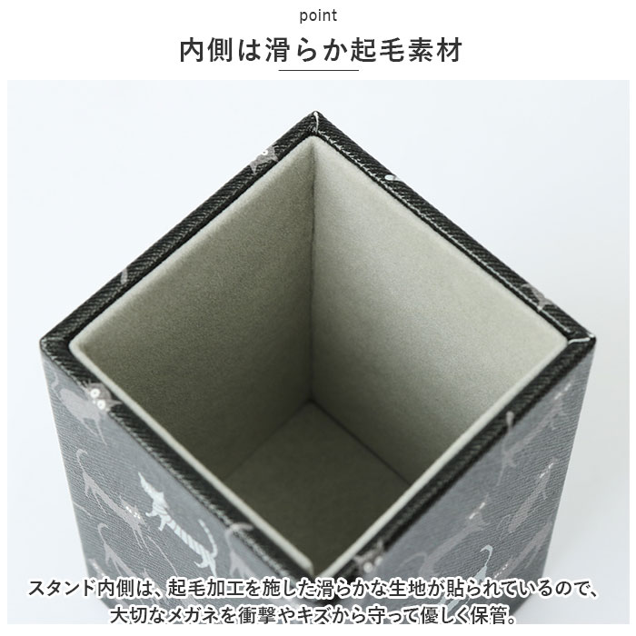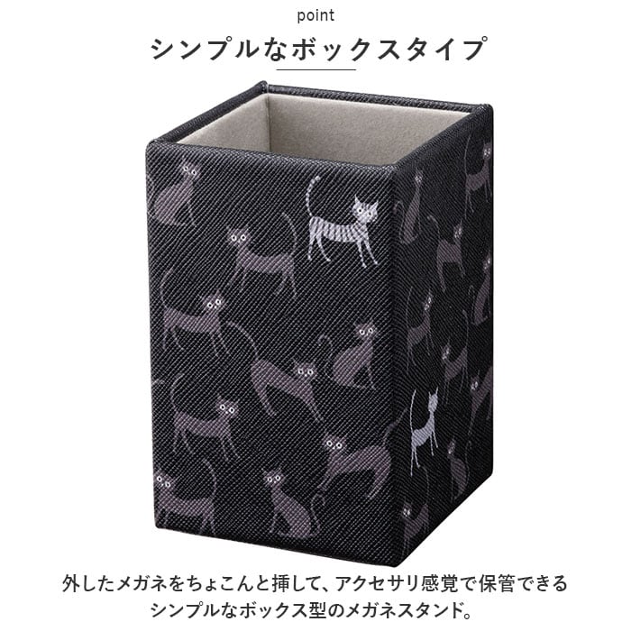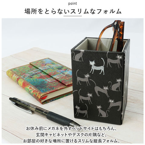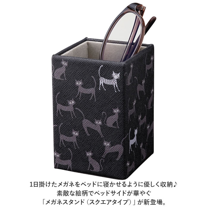 | 商品説明 | ・1日掛けたメガネをベッドに寝かせるように優しく収納♪素敵な絵柄でベッドサイドが華やぐ「メガネスタンド(スクエアタイプ)」が新登場。【シンプルなボックスタイプ】外したメガネをちょこんと挿して、アクセサリ感覚で保管できるシンプルなボックス型のメガネスタンド。【場所をとらないスリムなフォルム】お休み前にメガネを外すベッドサイドはもちろん、玄関キャビネットやデスクの片隅など、お部屋の好きな場所に置けるスリムな縦長フォルム。【内側は滑らか起毛素材】スタンド内側は、起毛加工を施した滑らかな生地が貼られているので、大切なメガネを衝撃やキズから守って優しく保管。【水滴に強いフェイクレザー素材】ボックス表面は、キメの細かい角シボの刻まれたフェイクレザー素材を使用。水滴や汚れがサッと拭き取れるので、洗面化粧台など水回りに置いても安心!(※防水仕様ではありません。内側は起毛素材なので濡らさないように注意してください。)【使い方はアイディア次第】メガネスタンドとしてはもちろん、オフィスや子ども部屋ではペンスタンドとして、化粧台ドレッサーではチークブラシやリップブラシ立てにするなど、使い方は自分次第♪【ほっこり心癒されるデザイン】きょとんと丸い目でこちらを見つめるネコちゃんや、絵画のような優しい色彩の花柄など、心癒される絵柄をバラエティ豊かにラインナップ。 |